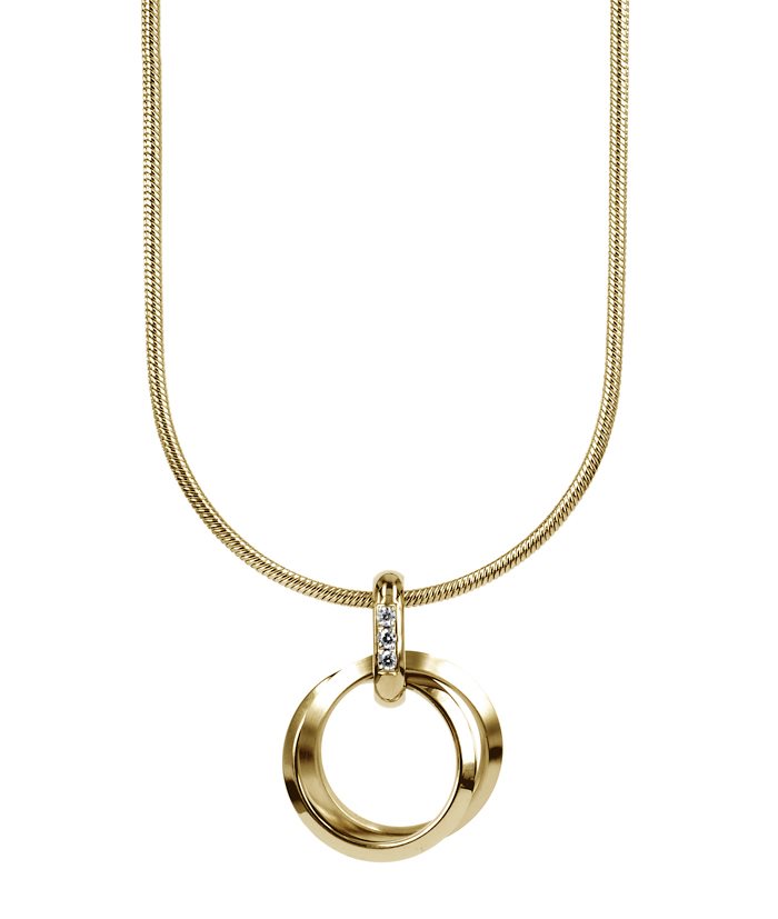 halsband med hänge av 2 sammanlänkade ringar med små stenar.