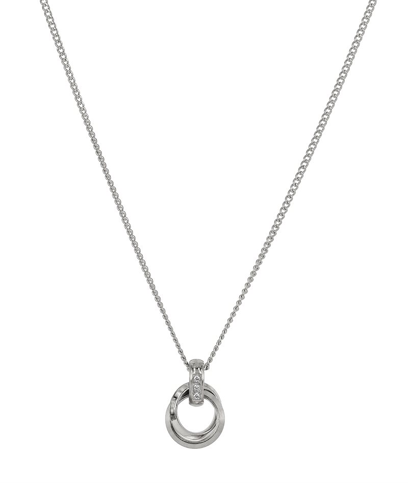 Halsband i stål med nätt kedja och hänge i form av 2 sammanlänkade ringar med små klara kristaller.