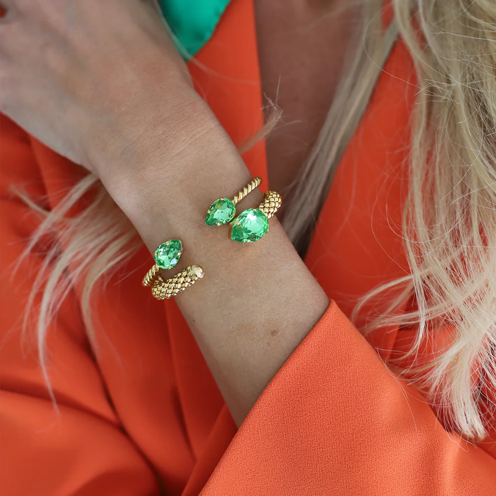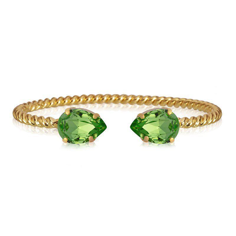 Vårt klassiska Mini Drop Bracelet är en stilfull detalj på din handled och gnistrar tack vare sina två droppformade kristaller av högsta kvalitet. Armbandet har en känsla av rep tack vare den vackert vridna metallen. Storleken kan justeras för att passa just din handled. Detta eleganta och gnistrande smycke passar alla