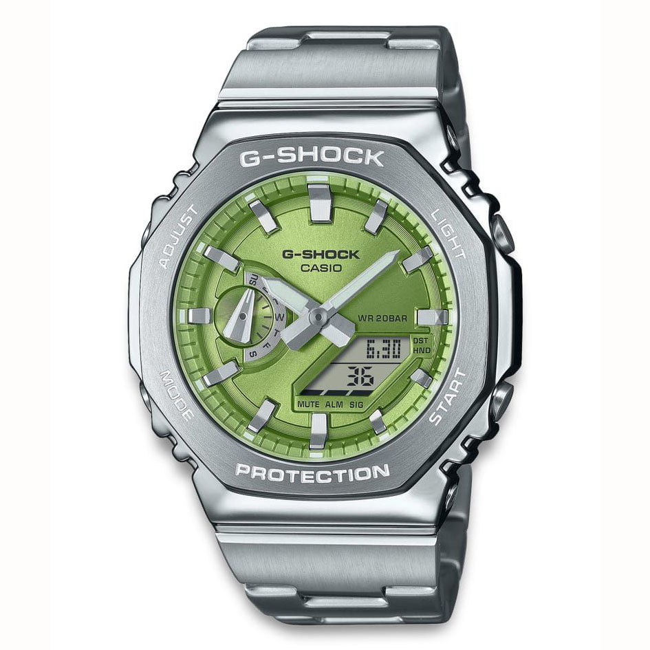 Artikelnummer GM-2110D-3AER Märke Casio G-Shock Typ Herr med länk Diameter 44 Tjocklek mm 11 Urverk Anadigi Rem/Länk Stållänk Glas Mineralglas Vattentäthet 20 ATM (200m) Färg på urtavla Grön Boettfärg Silver Boettmaterial Rostfritt stål Originalt artikelnummer GM-2110D-7AER
