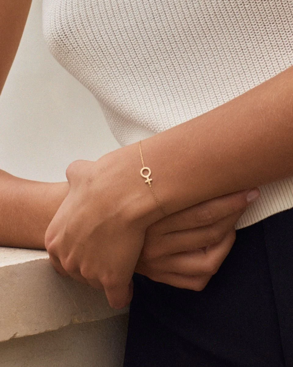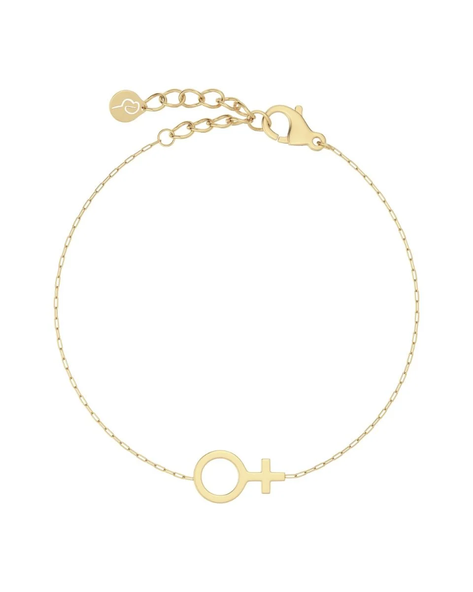 I serien Venus har symbolen en klassisk stilren design. I Venus armband hålls venussymbolen av en fin kedja med tunna rundade rektangulära länkar, här i blank 14K guldplätering. Bär gärna halsband och örhängen till armbandet.