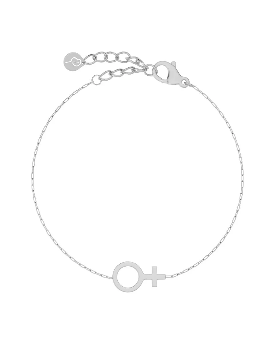 I serien Venus har symbolen en klassisk stilren design. I Venus armband hålls venussymbolen av en fin kedja med tunna rundade rektangulära länkar, här i blank stål. Bär gärna halsband och örhängen till armbandet.