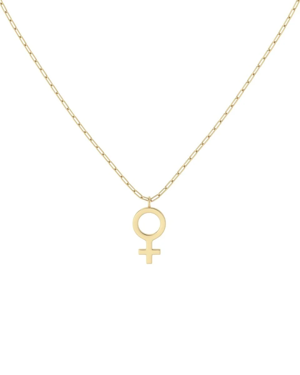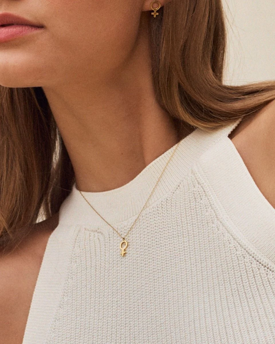 I serien Venus har symbolen en klassisk stilren design. I Venus halsband hänger venussymbolen i en fin kedja med tunna rundade rektangulära länkar, här i blankt 14K guldplätering. Bär gärna armband och örhängen till halsbandet.