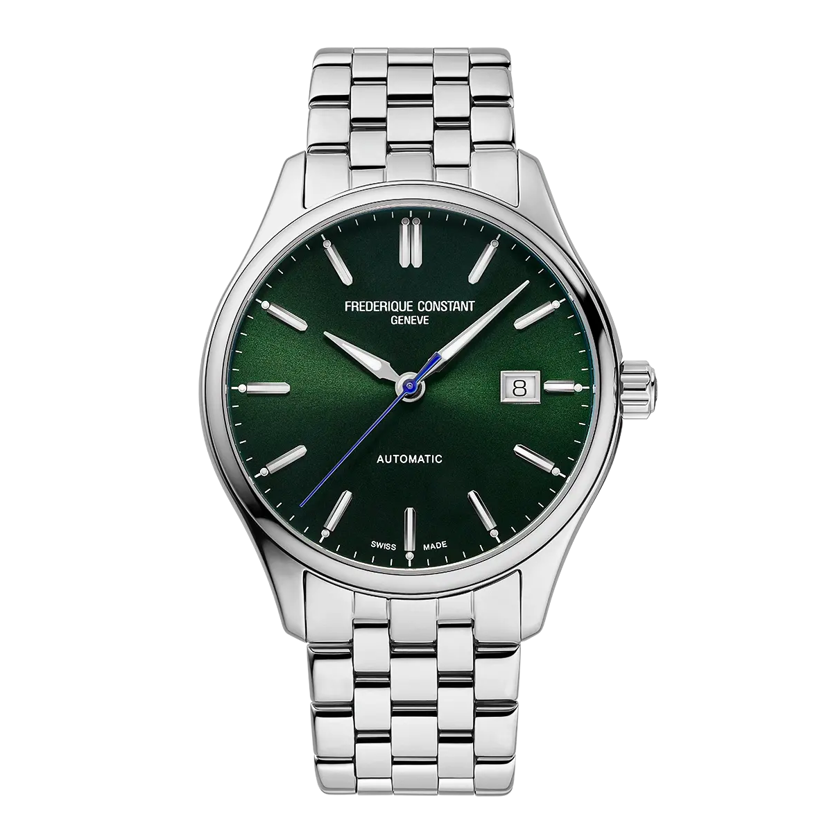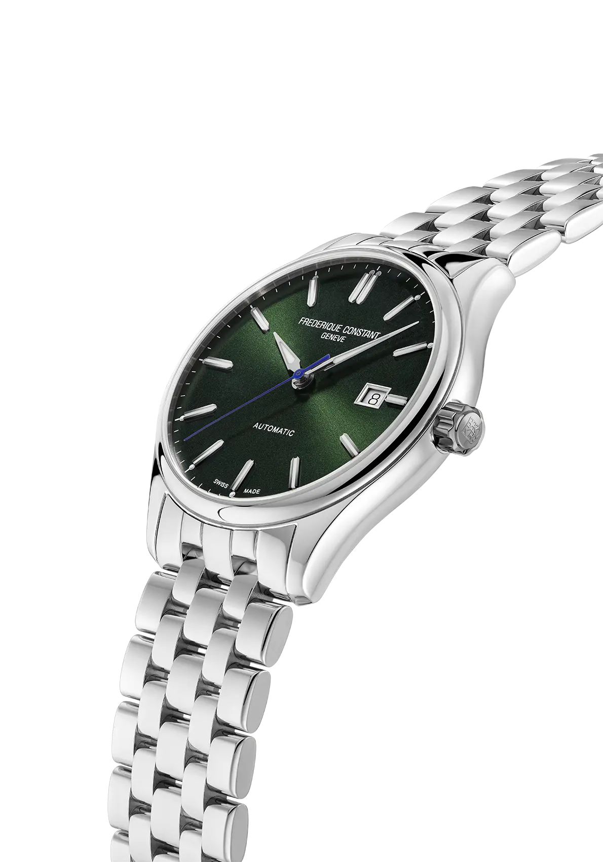 Upptäck Classics Index Automatic-klockan, en klocka som förkroppsligar kvintessensen av stil och precision. Dess polerade rostfria stålboett, med en diameter på 40 mm, inrymmer det automatiska urverket FC-303, som erbjuder en gångreserv på 38 timmar, 26 juveler och en frekvens på 28 800 vibrationer per timme för smidig och pålitlig tidtagning. Den solgröna urtavlan förstärks av pålagda timmarkörer och självlysande visare i rostfritt stål, vilket säkerställer utmärkt läsbarhet, kompletterat av ett praktiskt datumfönster vid klockan 3. Skyddas av ett konvext antireflexbehandlat safirglas och vattentålig till 5 ATM (50 m/164 fot), kompletteras denna klocka av ett femlänkat armband i polerat rostfritt stål, vilket ger optimal komfort och ett sofistikerat utseende under alla omständigheter.