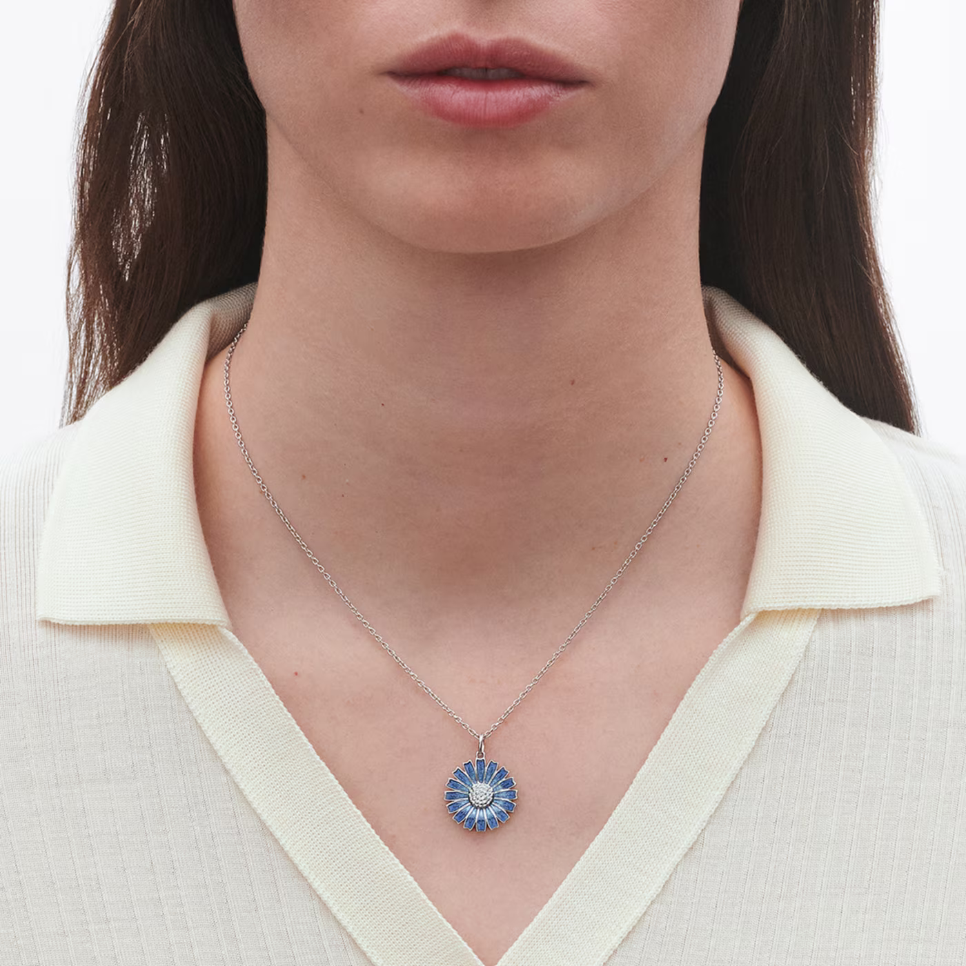 En blommande blå tusensköna på en kedja i sterlingsilver skänker liv åt detta eleganta hänge. Smycket är handmålat med emalj i en skirt blå nyans och har en mångsidig design som passar alla tillfällen – från formell till ledig. Daisy-hängsmycket är en del av Georg Jensens eftertraktade smyckeskollektion och har skapats med inspiration från det ikoniska blomstermotivet från en brosch från 1940-talet, som skänktes till H.M. Drottning Margrethe II.