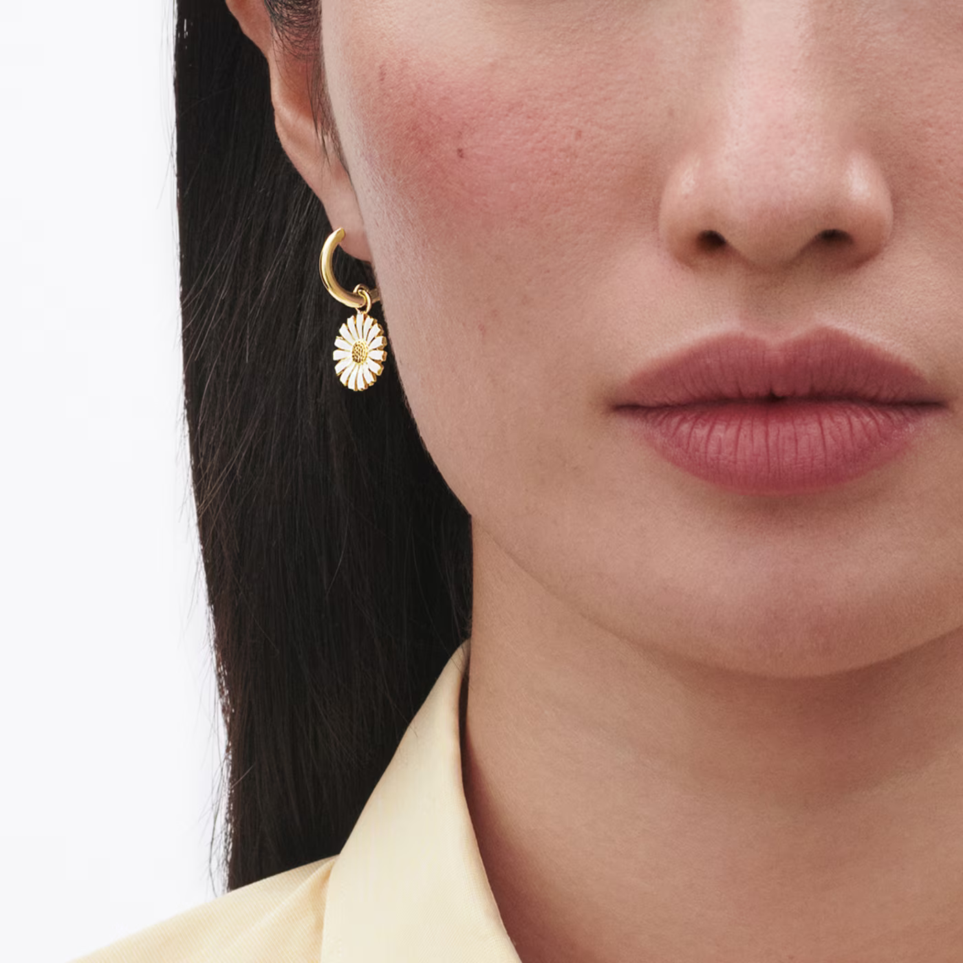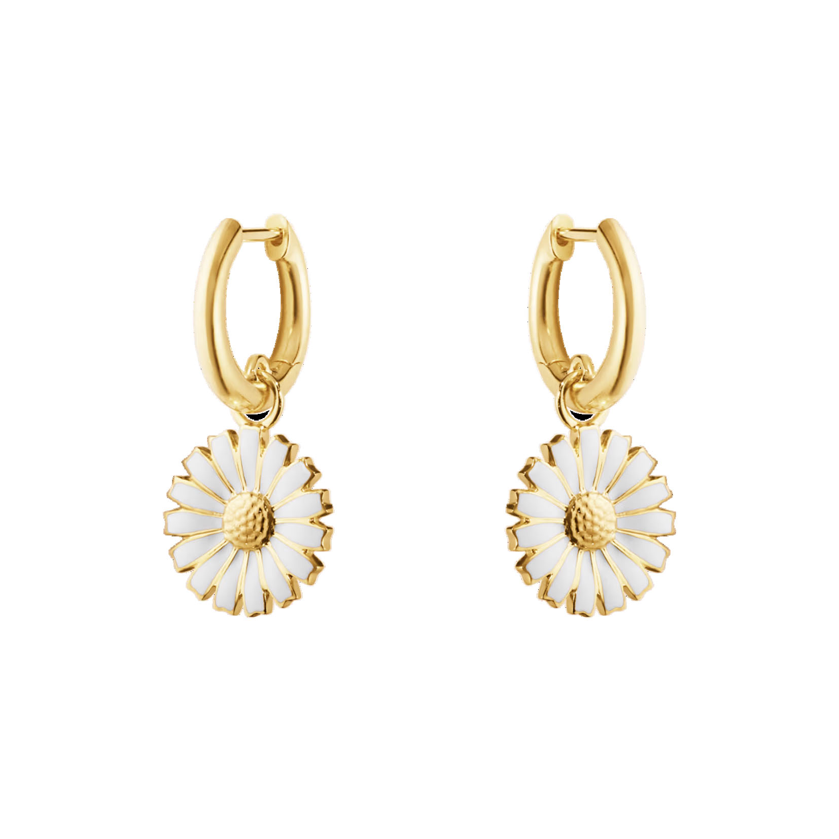 Dessa örhängen pryds av en ljuvligt vacker tusensköna och har en stilren unik design som passar alla stilar. Dessa örhängen är förgyllda med 18 karat gult guld och handmålade med vit emalj, och designen är en elegant uppdaterad version av det klassiska Georg Jensen-motivet. Dessa örhängen är inspirerade av en brosch med tusenskönor från 1940-talet som skänktes till H.M. Drottning Margrethe II.