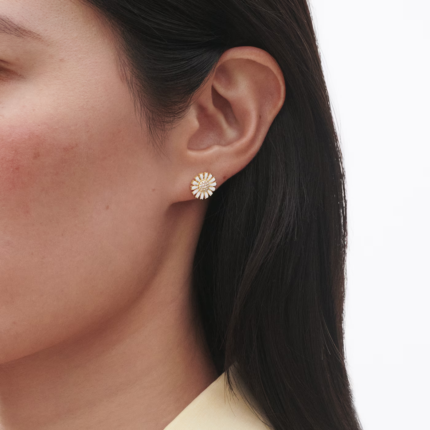 Förgyllda med 18 karat gult guld pryds dessa vackra stiftörhängen av handmålade tusenskönor i vit emalj – en tidlös detalj som ger en subtil blomsterkänsla. I mitten av blommorna strålar små diamanter, som tillför designen en diskret touch av lyx och elegans.
