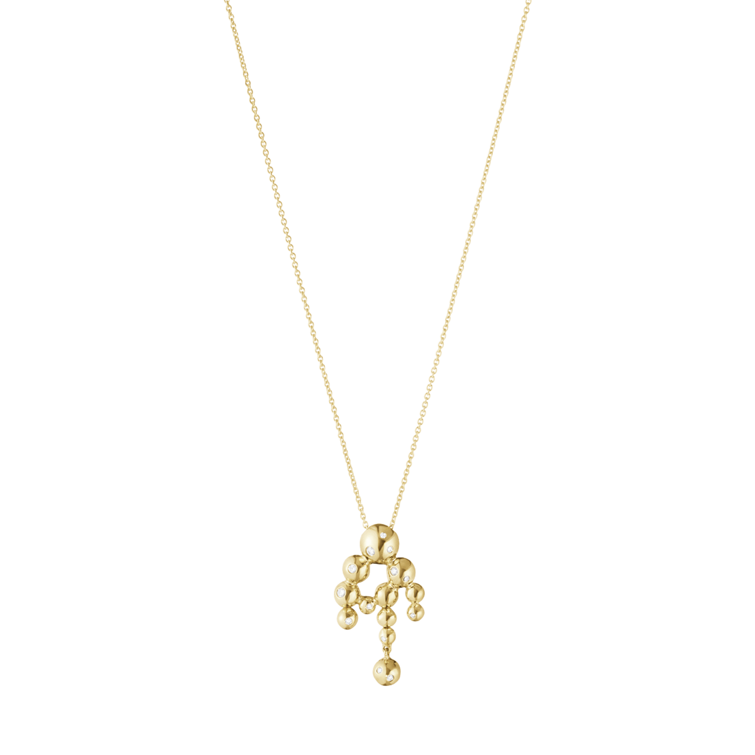 Detta hänge med 18 k guldkulor och diamanter faller vackert från en ankarkedja och följer personens rörelser. Designen är en stilren och modern tolkning av Georg Jensens ikoniska druvmotiv.