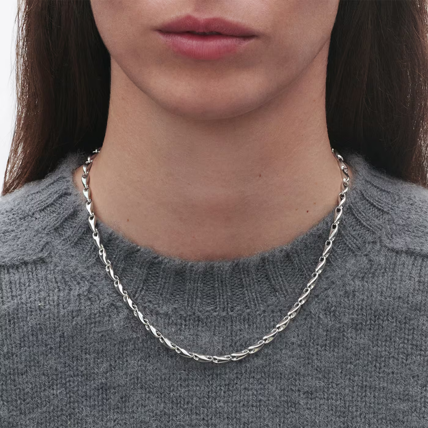 Det här halsbandet i sterlingsilver är en fräsch och modern tolkning av den traditionella kedjan och består av en serie organiskt formade länkar som förenas för att skapa denna hänförande design. Jacqueline Rabun hämtade inspiration från Punk när hon designade Reflect-kollektionen som är en hyllning till Georg Jensens hundraåriga arv. Kedjan kan justeras med hjälp av öglorna. Halsbandet kan bäras som en enkel kedja och matchas med andra smycken.
