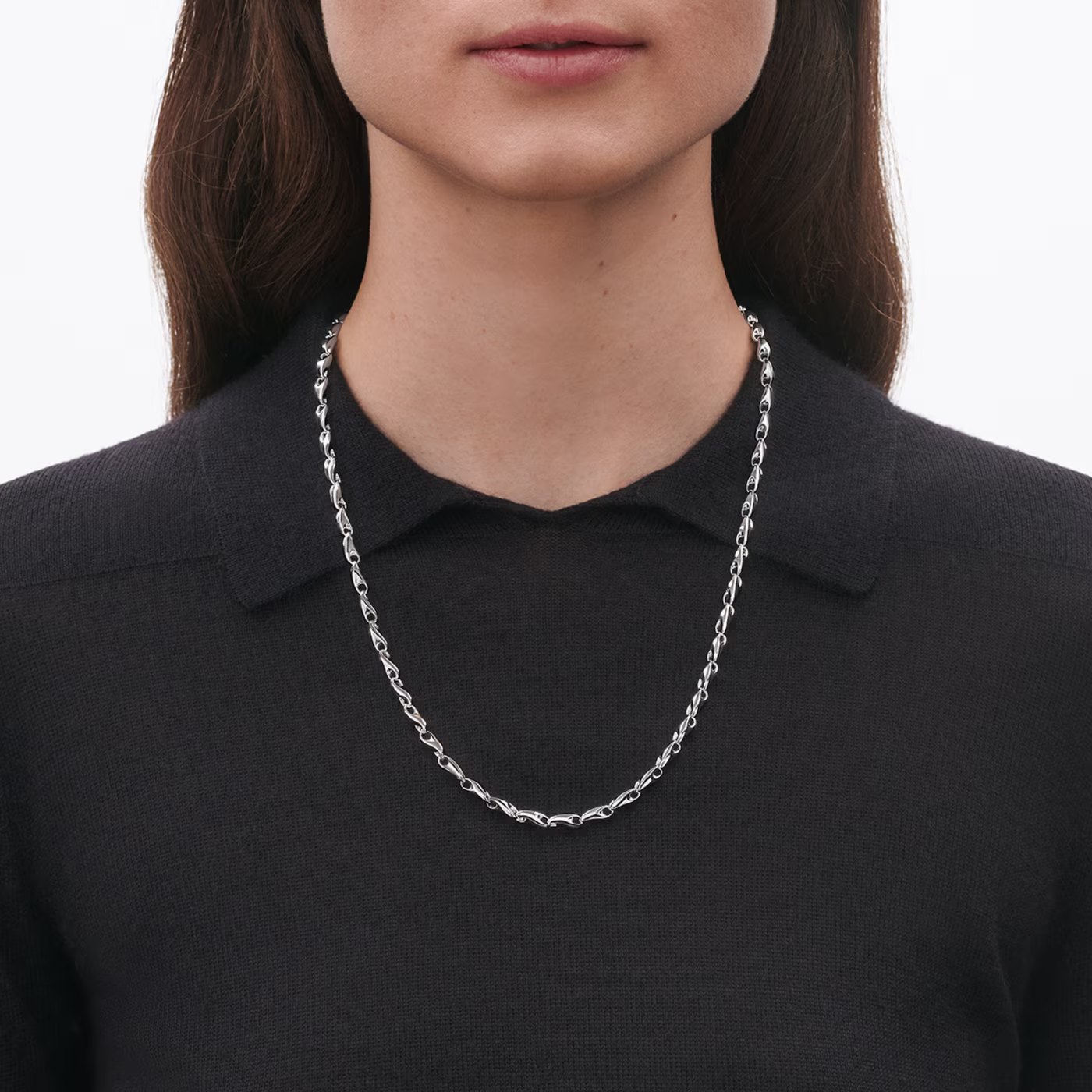 Det här halsbandet i sterlingsilver är en fräsch och modern tolkning av den traditionella kedjan och består av en serie organiskt formade länkar som förenas för att skapa denna hänförande design. Jacqueline Rabun hämtade inspiration från Punk när hon designade Reflect-kollektionen som är en hyllning till Georg Jensens hundraåriga arv. Kedjan kan justeras med hjälp av öglorna. Halsbandet kan bäras som en enkel kedja och matchas med andra smycken.
