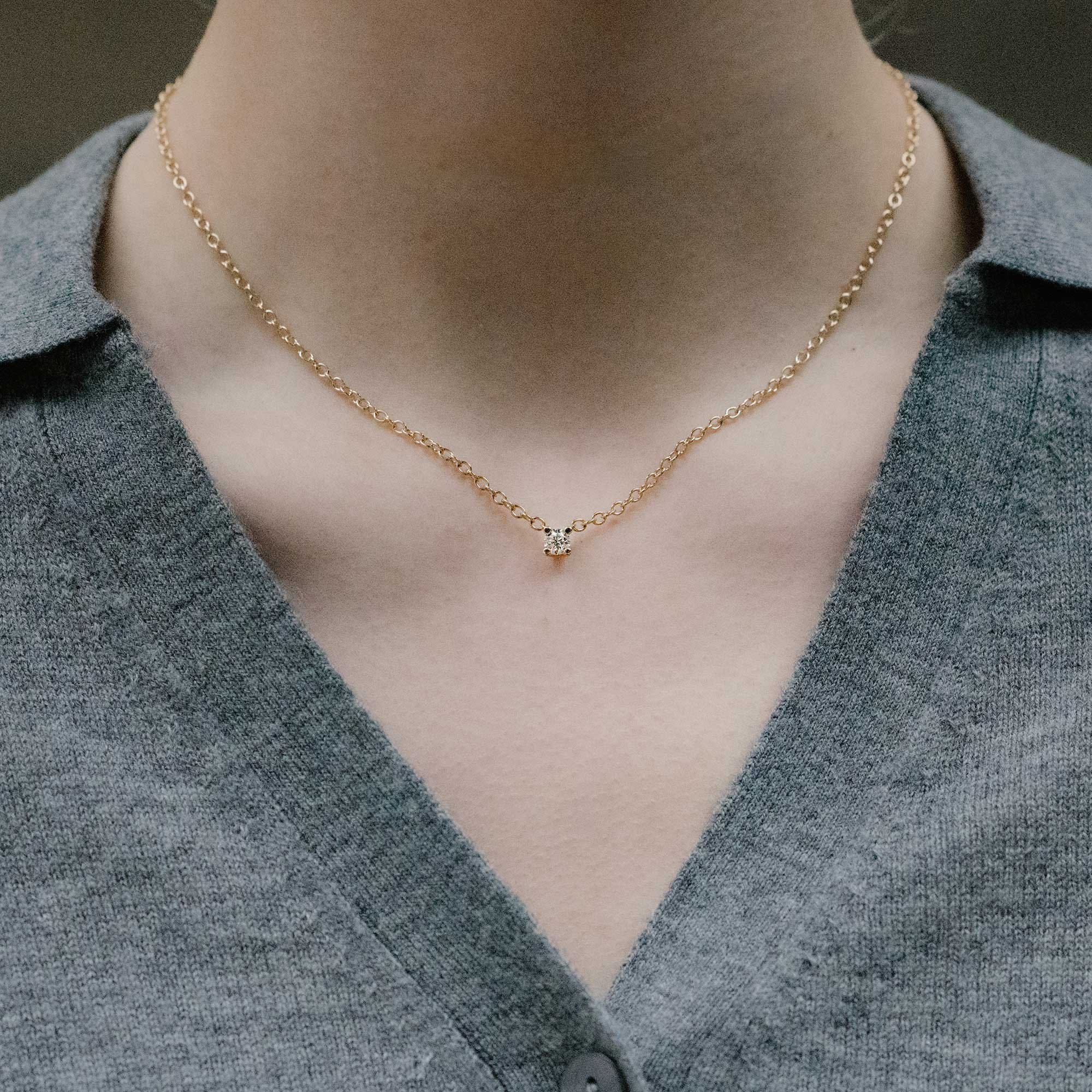 Bonnie halsgropskedja är den perfekta halsgropskedjan enligt oss. Den gnistrande briljantslipade diamanten fattas i fyra klor och glittrar vackert runt halsen. Den passar fint i skjortöppningen såväl som med t-shirten eller med cocktailklänningen, vi bär den till allt.