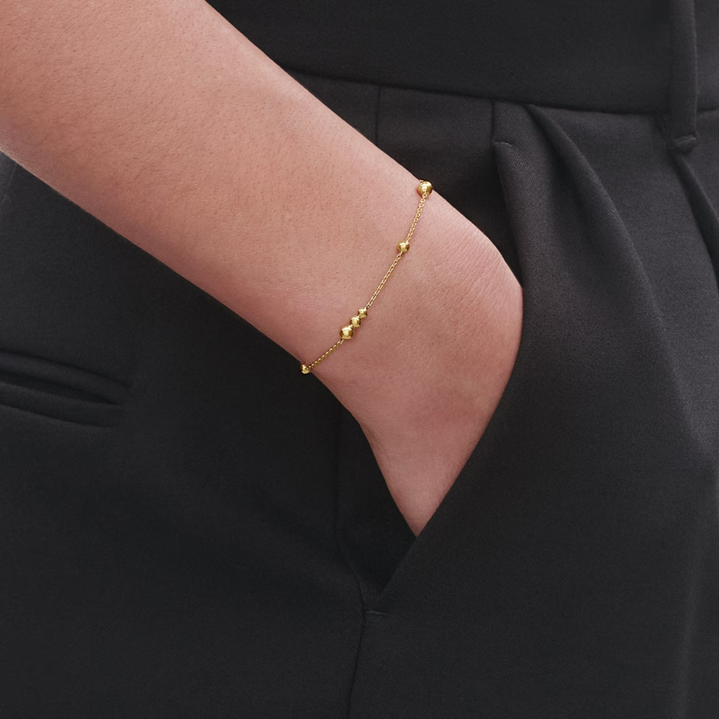 Små pärlor i 18 karat gult guld i olika storlekar hänger är trädda på en tunn guldkedja i detta utsökta armband. Armbandet är enkelt att bära både ihop med andra favoritarmband och som en separat och sofistikerad detalj.