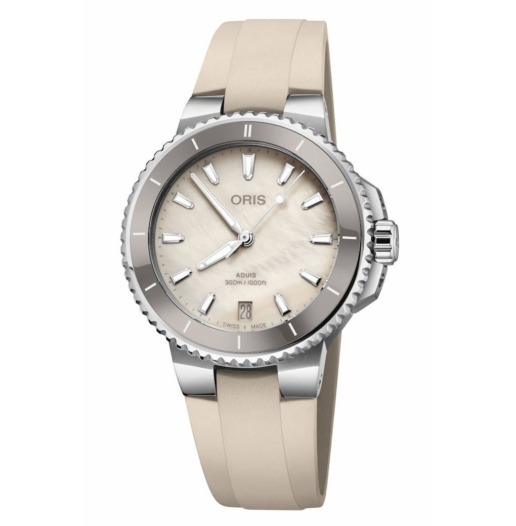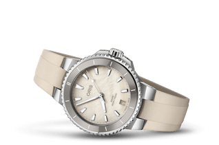 Urtavlan på denna Aquis Date 36,50 mm är färdig med en skiva skimrande crème pärlemor, vilket ger en glamorös viskning till vårt lyxiga vardagsverktygsur. Den är omgiven av ett vattentåligt hölje i rostfritt stål och en schweizisk automat verk..