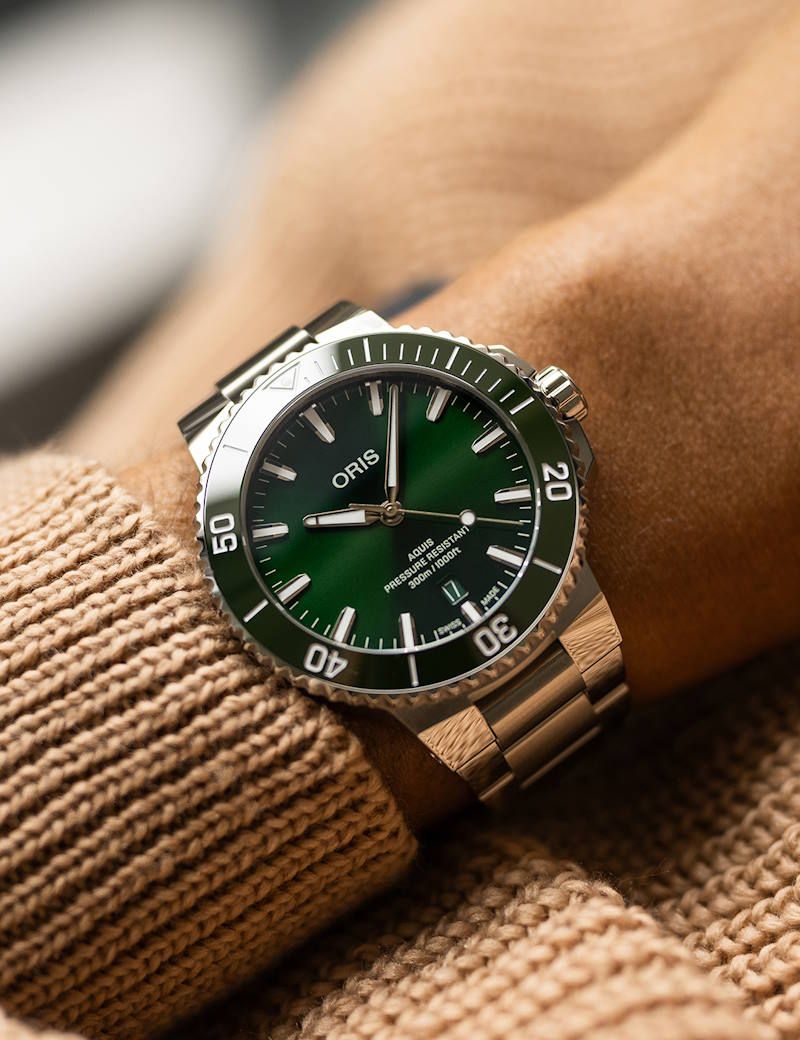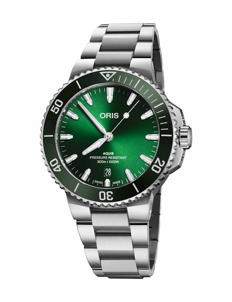 I grönt är Aquis Date 41,50 mm den definitiva sportklockan. Raffinerad och ändå högpresterande, det är en modern mångsidig klassiker, backad upp av vattentäthet till 30 bar (300 meter) och en enkelriktad roterande ram med en keramisk ring.