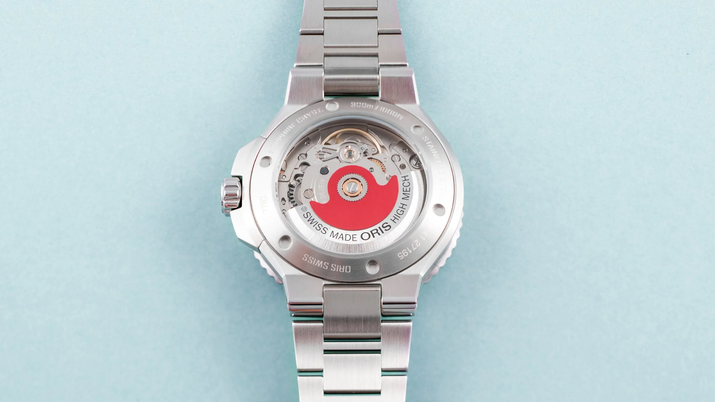 Urverk: Automatic winding, bi-directionally rotating red rotor. 38 timmar gång reserv. Oris 733, base SW 200-1