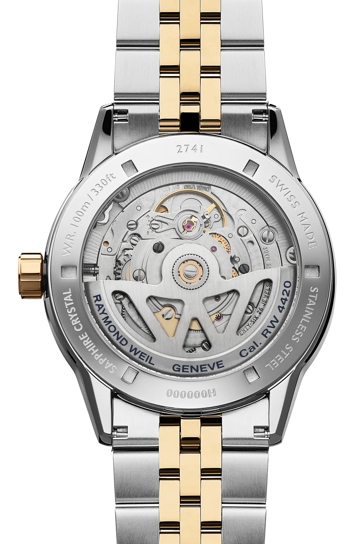 Det tvåfärgade armbandet, utrustat med ett dubbelt tryckvikspänne, erbjuder både komfort och säkerhet. En nedskruvad krona präglad med RW-monogrammet och en transparent safirfärgad baksida avslöjar det automatiska urverket inuti och visar upp den W-formade oscillerande vikten – en distinkt signatur för varumärket. Vattentålig upp till 100 meter, förkroppsligar denna klocka både prestanda och elegans.
