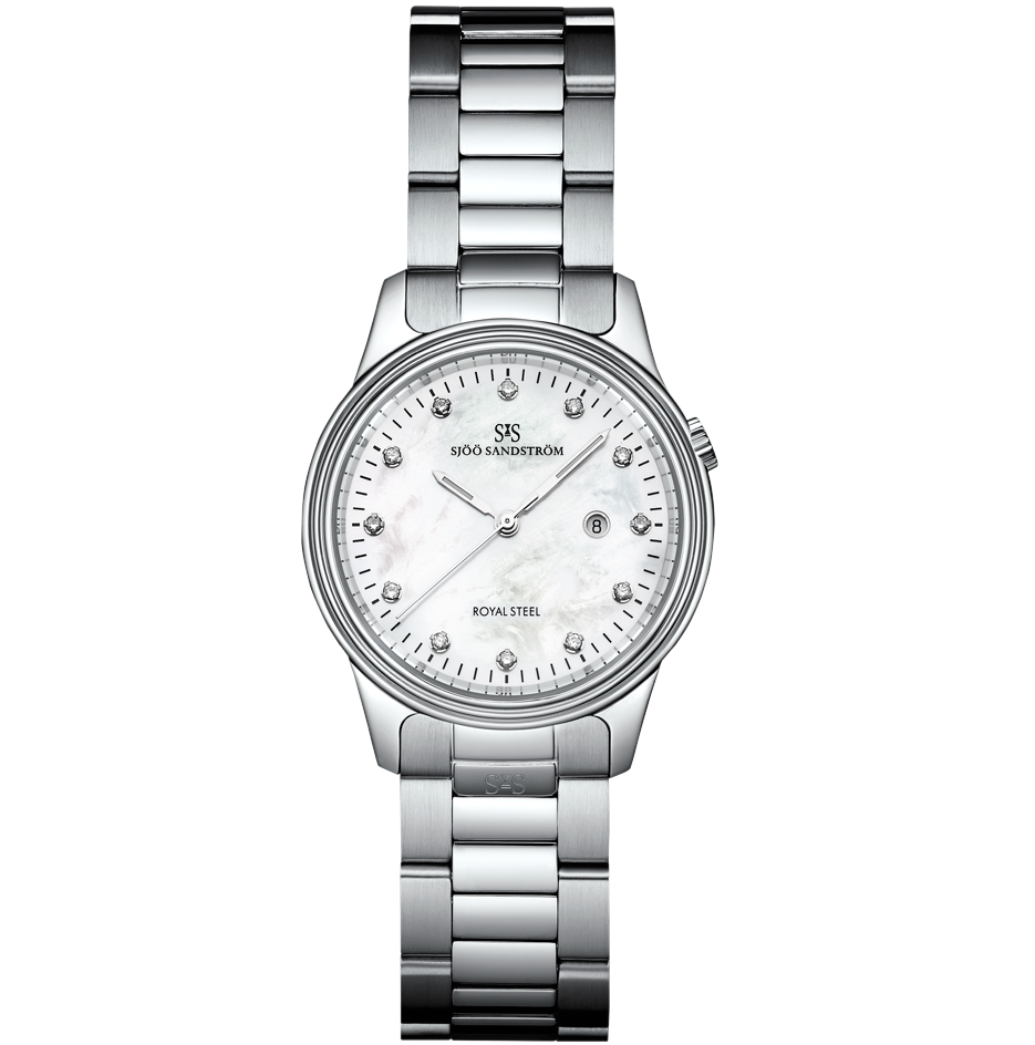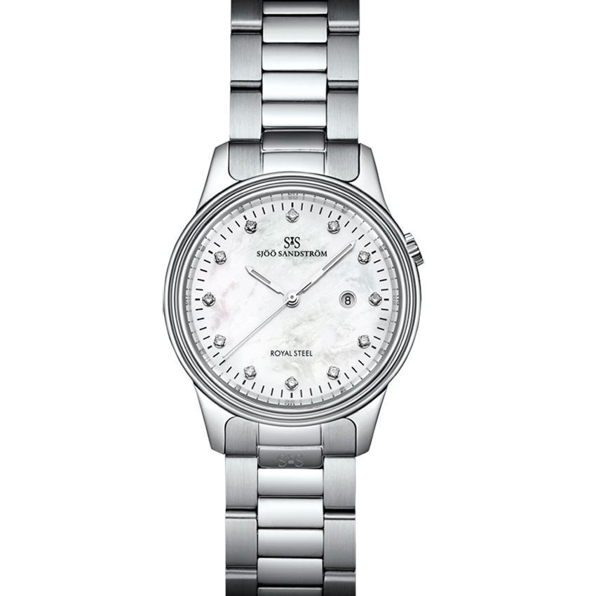 Vår första dammodell, Royal Steel Classic 32, utgör själva kärnan i Sjöö Sandström. Denna klassiska klocka representerar den 4:e generationen av Automatic S1, som var den första klockan vi gjorde och det första armbandsuret någonsin som designades och tillverkades i Sverige, med premiär 1993 med vit urtavla och svart armband. De tre ringarna på fodralets yttre kant ger både en slät yta som eliminerar repor mot skjortärmen och en representation av vår plats i universum – Stockholm/Sverige/Världen.