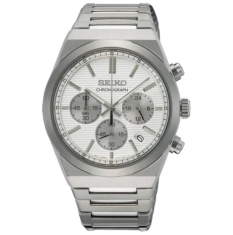Denna SSB451P1 kvartskronograf från Seiko SPORT-kollektionen erbjuder en hel rad funktioner. Urtavlan rymmer de tre räknarna som är typiska för kronografer. Tillverkad helt i rostfritt stål, är denna modell också mycket robust med sin safirglas, skruvade baksida och vattentäthet till 100 meter.