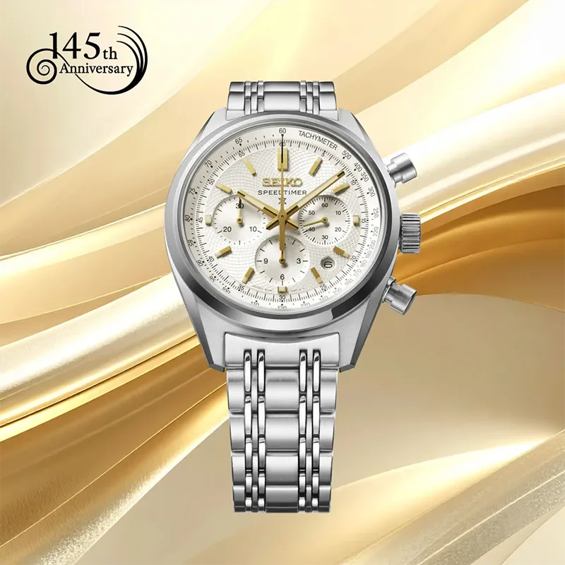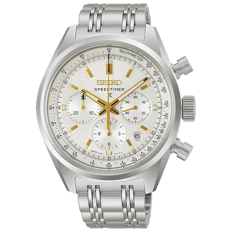 Den nya jubileumsmodellen Speedtimer SRQ059J1 fortsätter hyllningen till Seikos början. Urtavlan har också Nanako-mönstret. I en silvervit färg som utstrålar klarhet och elegans, kombinerat med gyllene accenter som ger värme och värde. Den fina Nanako-reliefen skapar ett fascinerande djup. Beroende på ljusinfallet skapas subtila nyanser som ger urtavlan liv och en nästan skimrande textur. Boettens böljande linjer och det flerradiga armbandet är en referens till den legendariska ”Panda”-kronografen från 1972, en sann del av Seikos historia. Trots sin slående närvaro är kronografen fortfarande bekväm att bära: 42 mm i diameter, 14,6 mm hög och med en sofistikerad boettform som gör att den ser smalare ut. Den automatiska kalibern 8R48 med kolumnhjul och vertikal koppling säkerställer exakta kronograffunktioner.