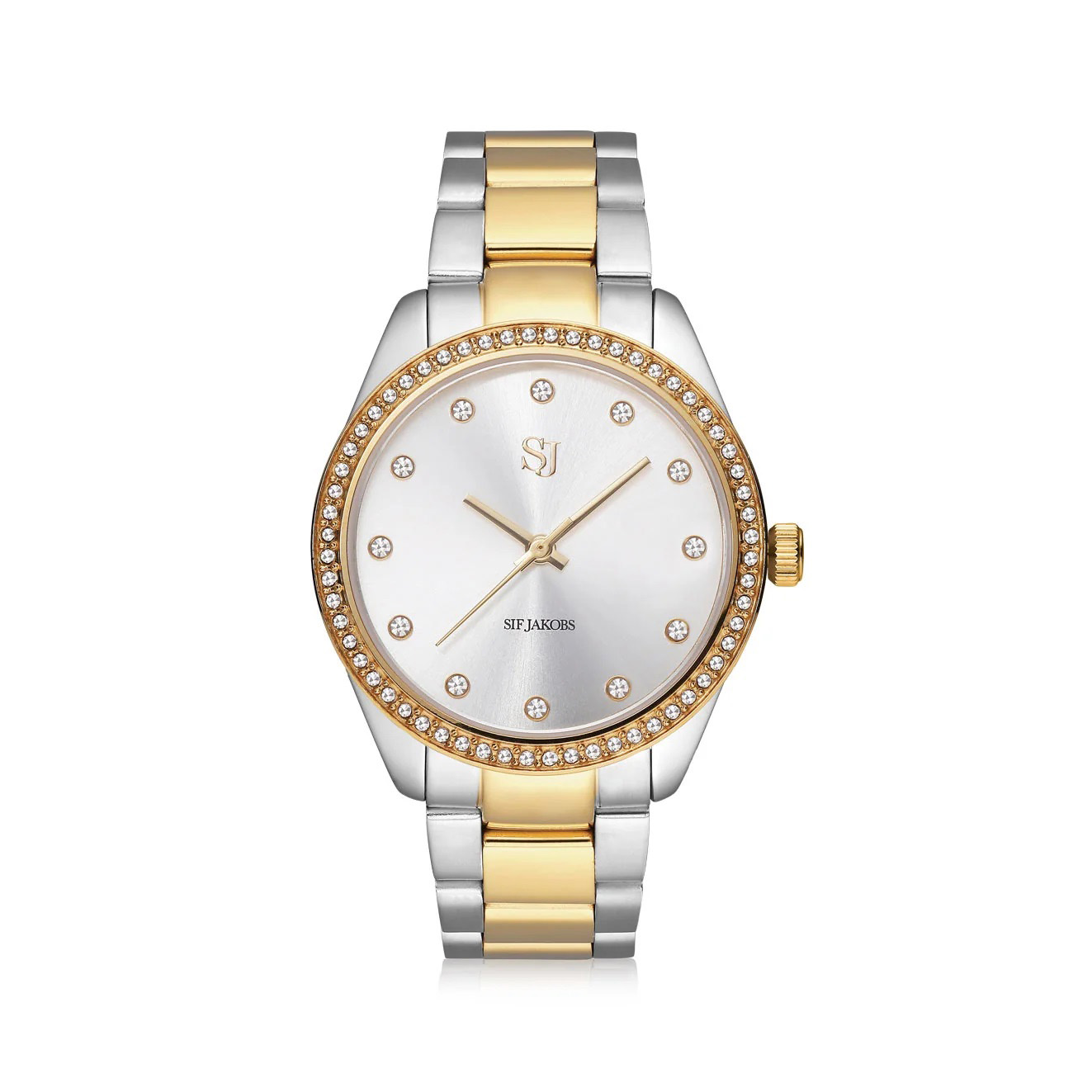 Klocka av guldpläterat och rostfritt stål, polerad och borstad yta, med safirglas och silver sunray urtavla, dekorerad med vit zirconia. Vattenbeständighet 50 m.