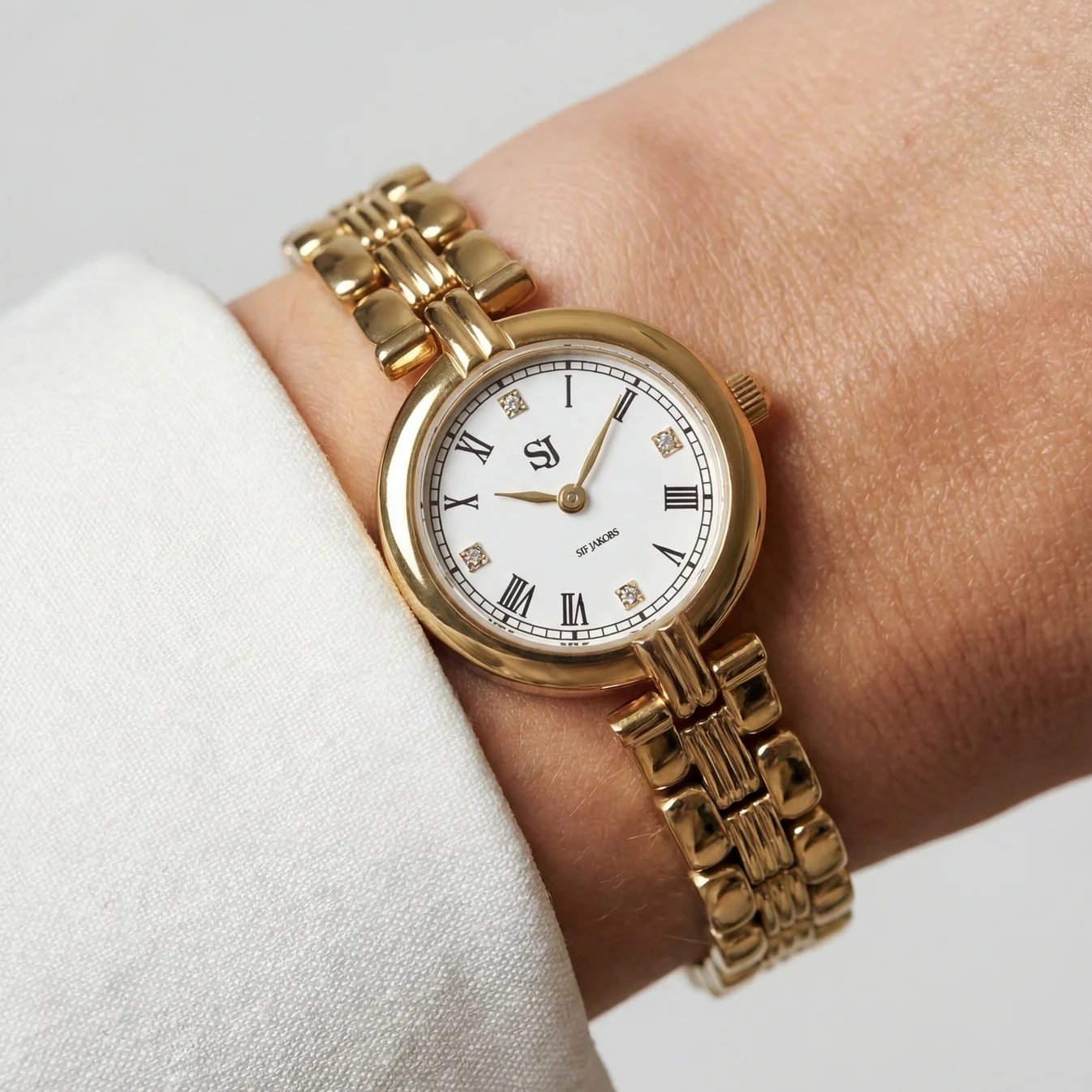 Klocka i guldpläterat rostfritt stål, polerad yta med safirglas och matt vit urtavla.
