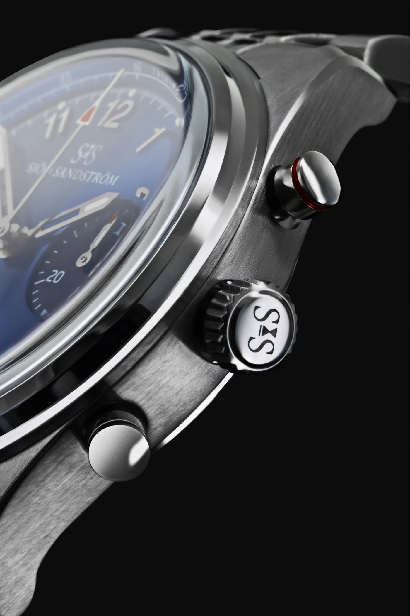Royal Steel Chronograph levereras med en nyutvecklad, 7-delad länk där de fem mindre innerlänkarna är polerade och de två yttre är satinborstade, en kombination som skapar ett diskret men levande uttryck. För den som föredrar en sportigare känsla finns modellen även med ett gummiband, som har Sjöö Sandströms karaktäristiska timglasmönster. Det är samma formspråk som återfinns på gummibandet till Royal Steel Worldtimer, men nu anpassat för den nya kronografen.