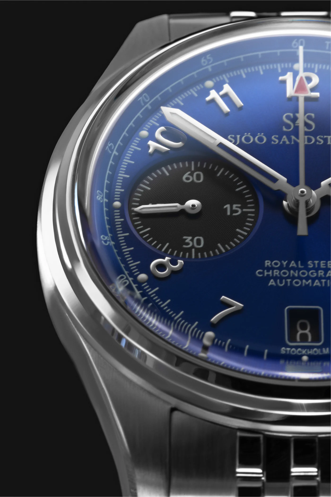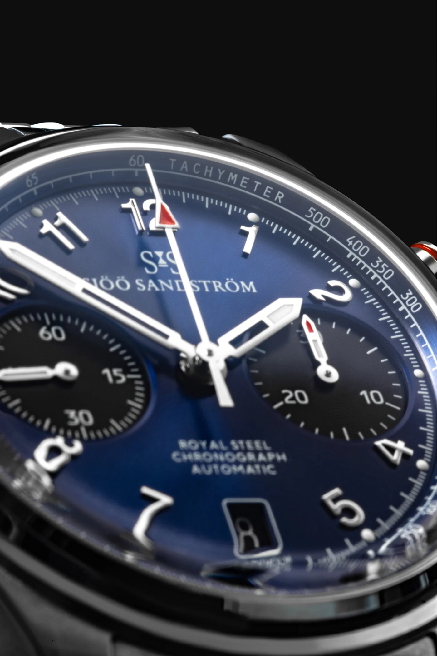 Royal Steel Chronograph är en nyutveckling och markerar ett nytt steg i varumärkets kollektion. Boetten mäter 40 mm och är tillverkad i rostfritt stål. Genom safirglaset på klockans bakboett, syns det nya mekaniska verket SSG17. Klockan kommer i tre olika färger på urtavla, svart, blå och vit. Det arabiska siffrorna på urtavlan ger ett tydligt och kraftfullt uttryck.