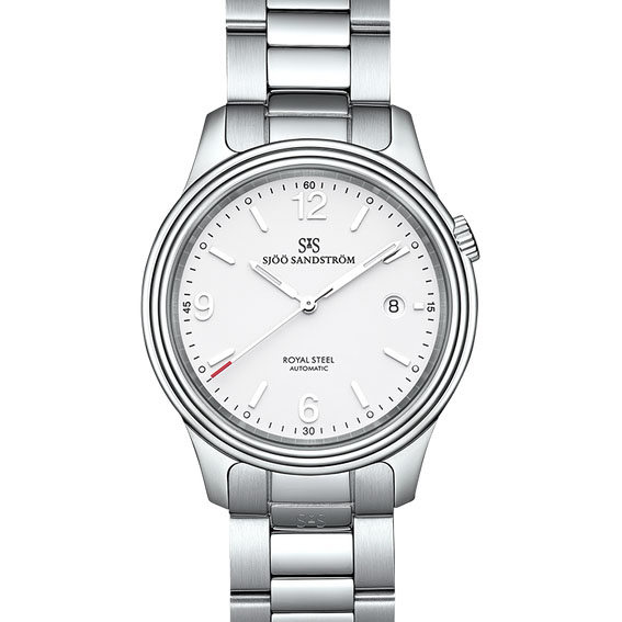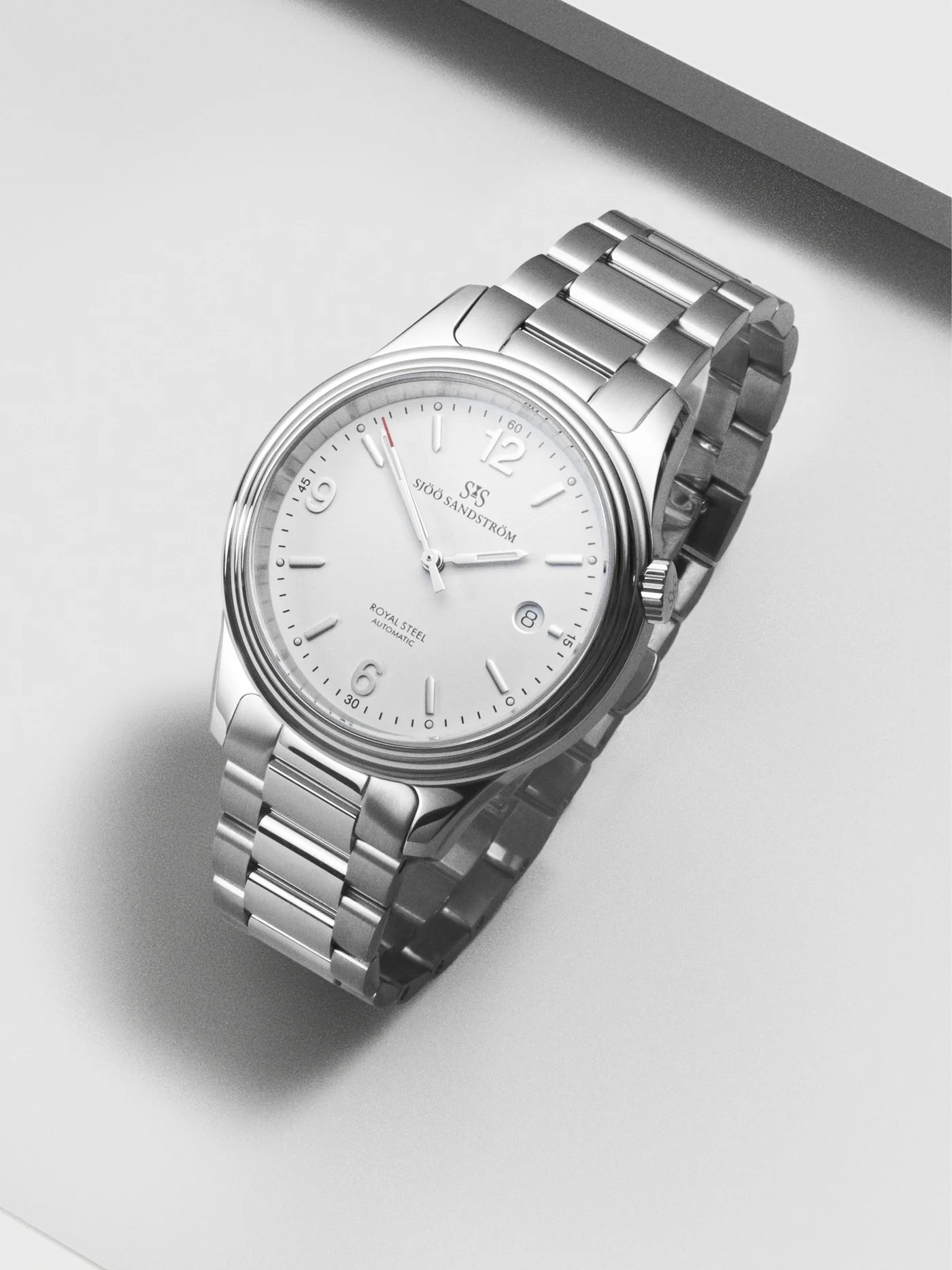 Royal Steel Classic erbjuder ett tidlöst uttryck med en svensk twist av elegans, och utgör själva kärnan och grunden för Sjöö Sandström. Denna klassiska klocka representerar den 4:e generationen av Automatic S1, som var den första klockan vi gjorde och det första armbandsuret någonsin som designades och tillverkades i Sverige, med premiär 1993 med vit urtavla och svart armband. De tre ringarna på fodralets yttre kant ger både en slät yta som eliminerar repor mot skjortärmen och en representation av vår plats i universum – Stockholm/Sverige/Världen.