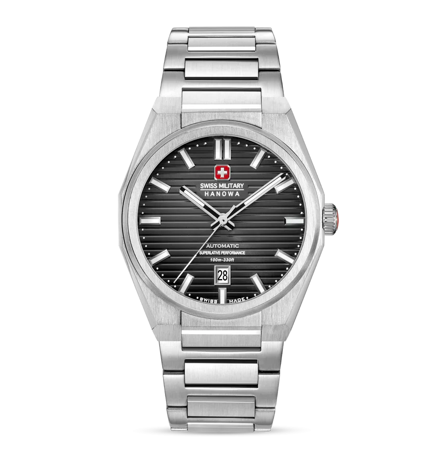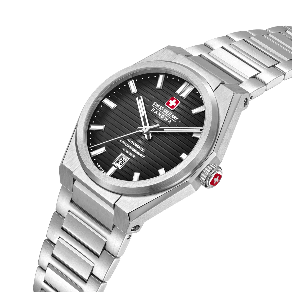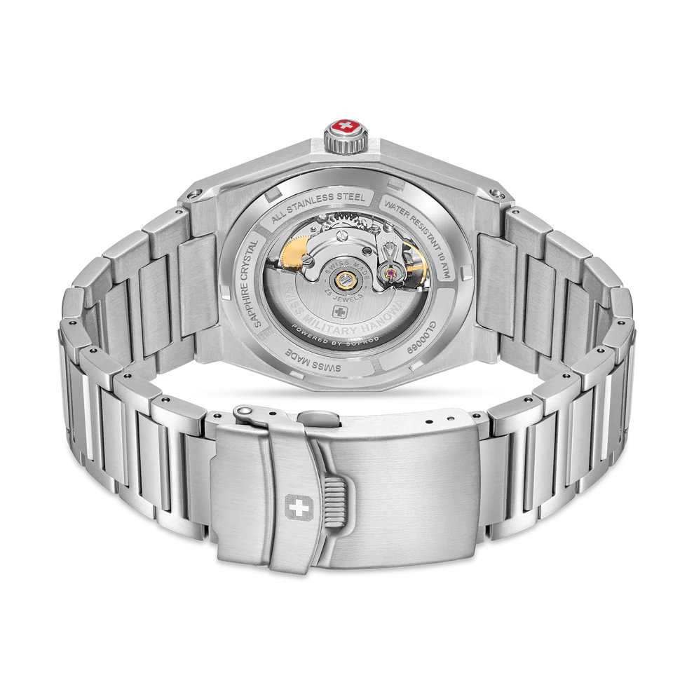 En minimalism definierar Swiss Military Hanowa Avalanche. Den kombinerar styrka och elegans med sin kantiga boett. Den blå urtavlan har ett elegant linjärt mönster, medan den framträdande boetten och armbandet ger djup. Drivs av ett automatiskt självuppdragande urverk, inkluderar den en genomskinlig baksida. Ren, avslappnad och elegant, Avalanche utmärker sig med diskret självförtroende.