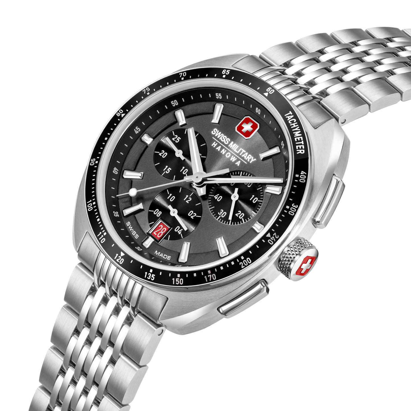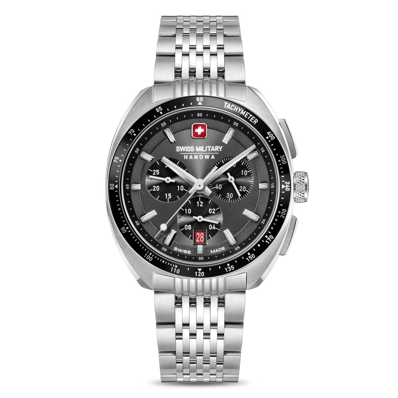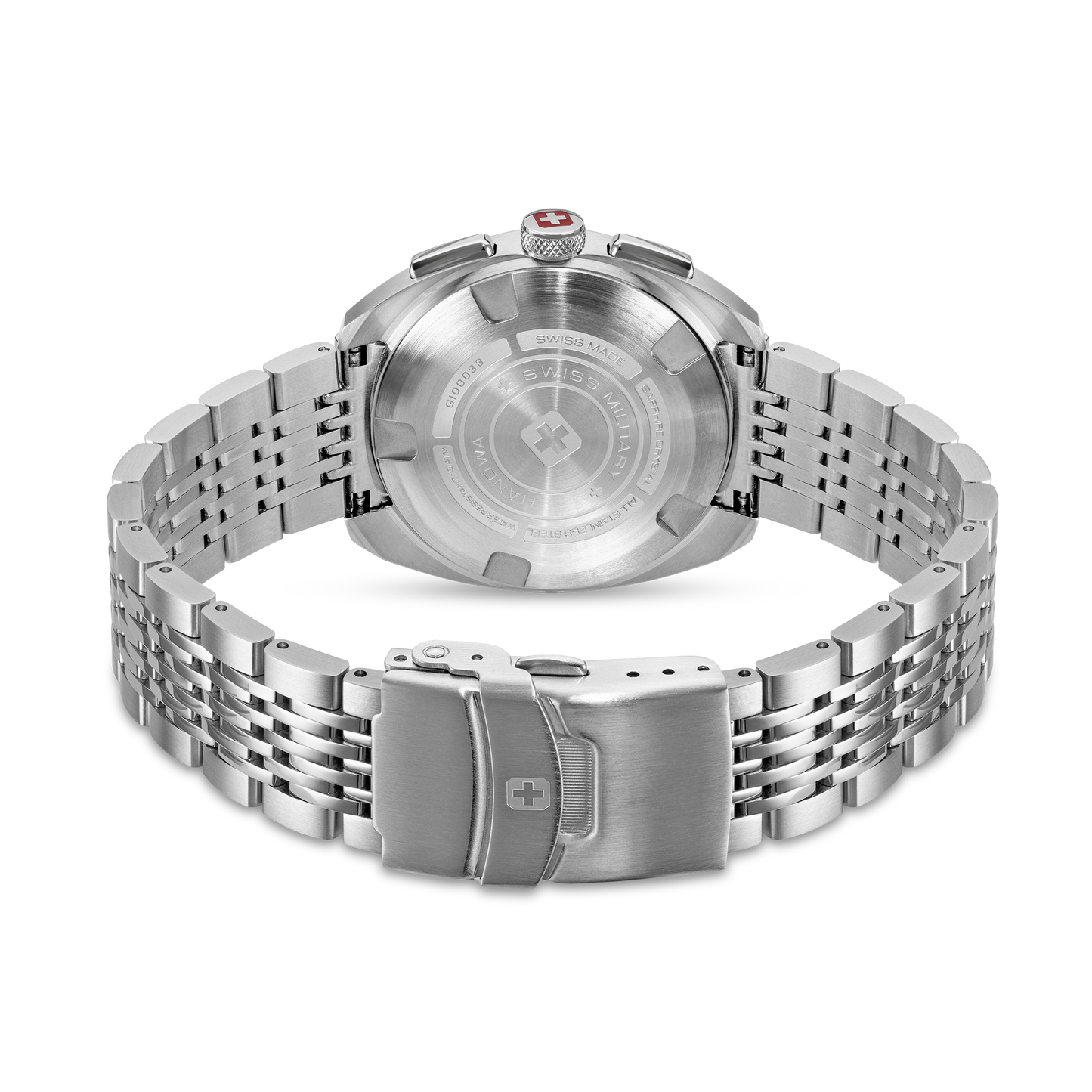 Denna Swiss Military Hanowa klocka har ett boett av rostfritt stål med en diameter på 41 mm och är försedd med ett metalband. Drivs av ett Rond kronograf verk och klockan har en safirglas.