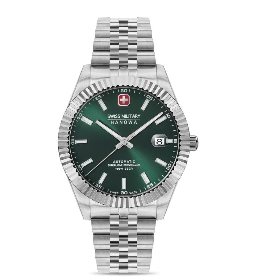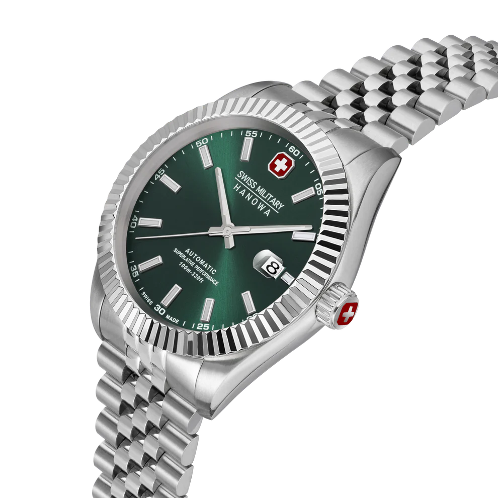 Denna Swiss Military Hanowa klocka har ett boett av rostfritt stål med en diameter på 41 mm och är försedd med ett metalband. Drivs av ett Soprod-verk och klockan har en safirglas.