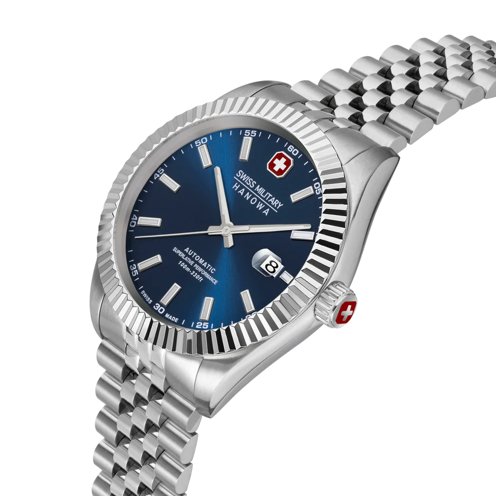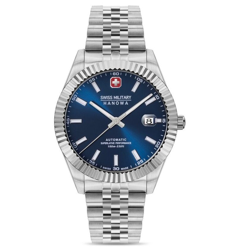 Denna Swiss Military Hanowa klocka har ett boett av rostfritt stål med en diameter på 41 mm och är försedd med ett metalband. Drivs av ett Soprod-verk och klockan har en safirglas.