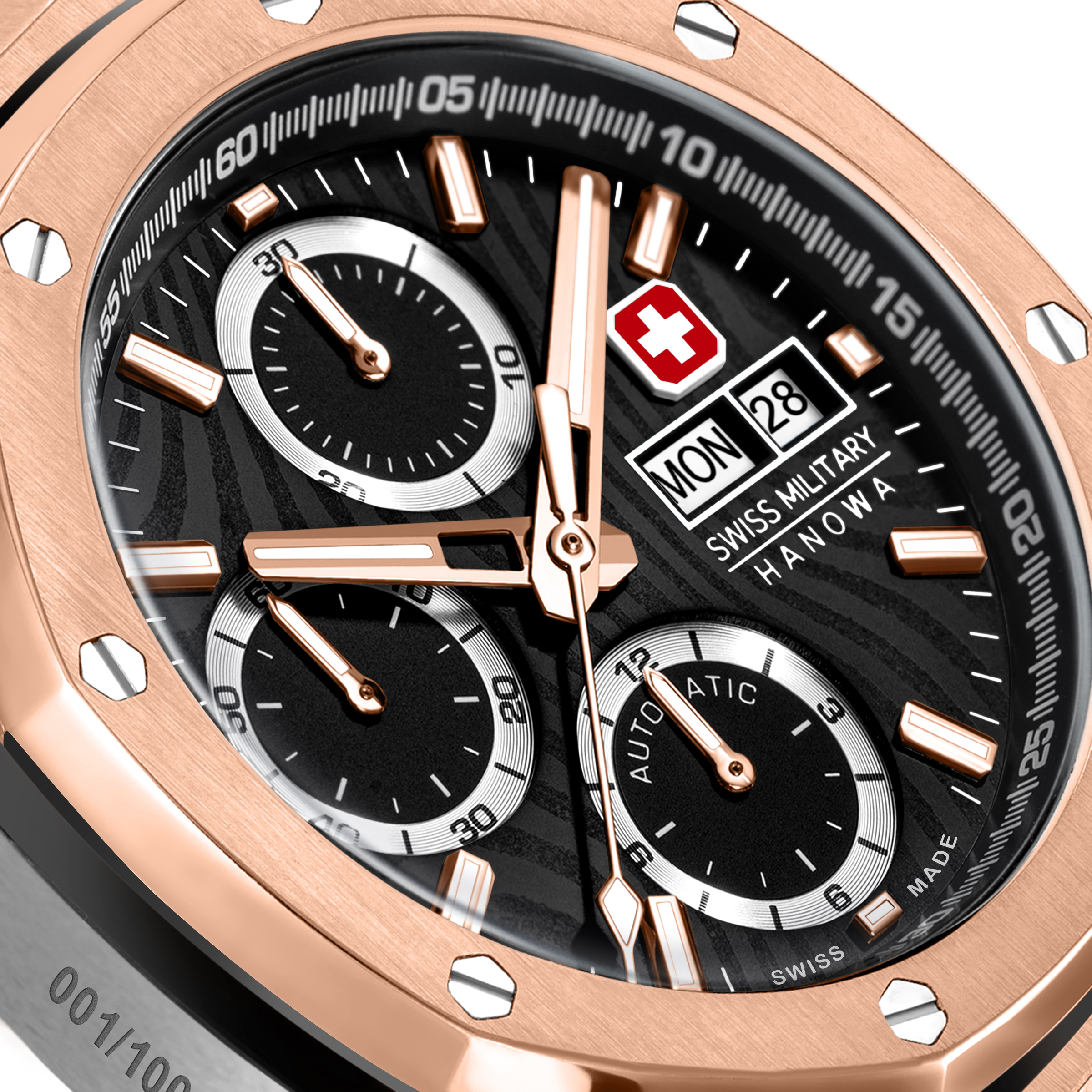 Swiss Military Hanowa Helvetica kombinerar sportig stil med en unik hyllning till de schweiziska bergen. Dess 42 mm hölje i rostfritt stål/bic rymmer en hydrauliskt stämplad svart urtavla med en strukturerad design. Skyddad av en klar safirglas ger urtavlan tydlig läsbarhet. Det pålitliga Swiss Made eta valjoux 7750 har tre visare med datumfunktion. Klockan har 10 ATM vattentäthet och är utrustad med ett bekvämt armband i rostfritt stål, vilket gör den till den perfekta följeslagaren för alla äventyr.