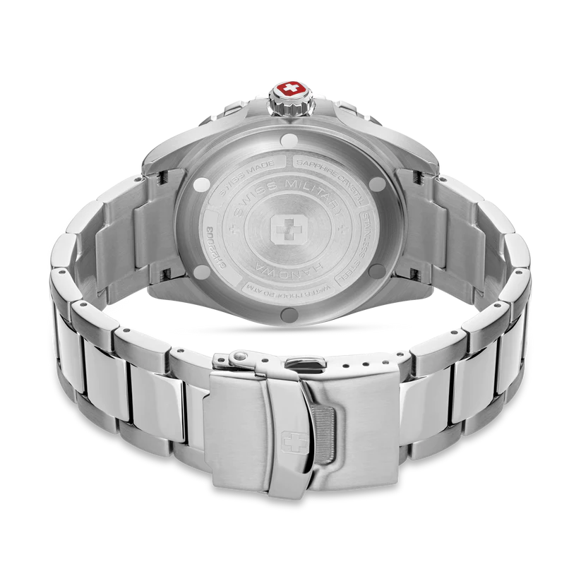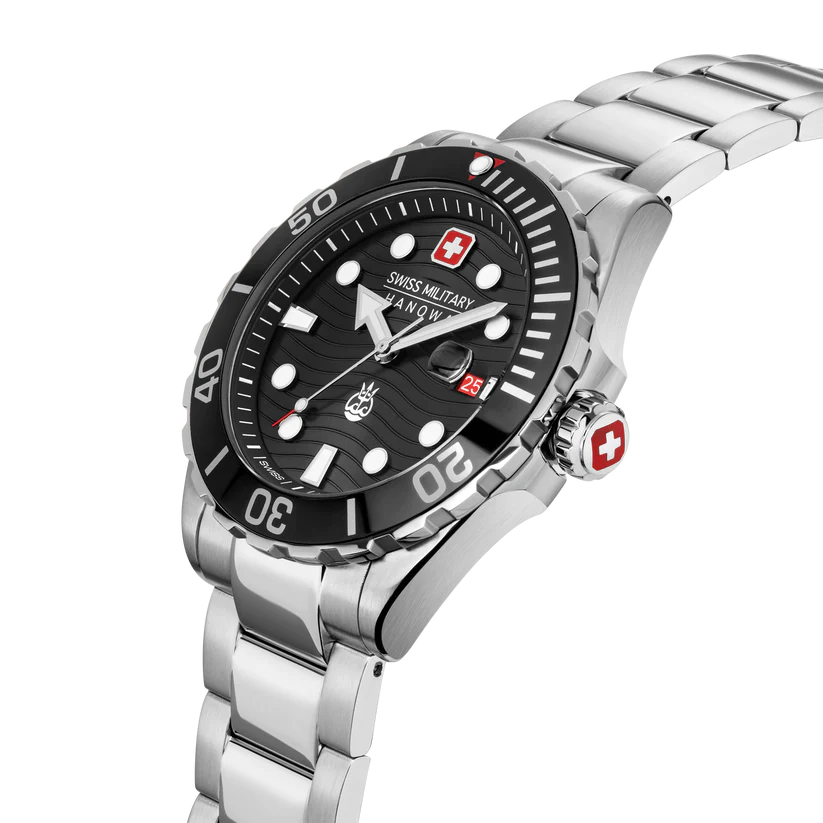 Den robusta 44 mm Swiss Military Hanowa Offshore Diver II har en enkelriktad roterande ram, skruvad krona och ökar en vattentålighet upp till 20 bar. Denna klocka känns bekväm med alla vattensporter, oavsett om det är dykning, simning eller surfing.