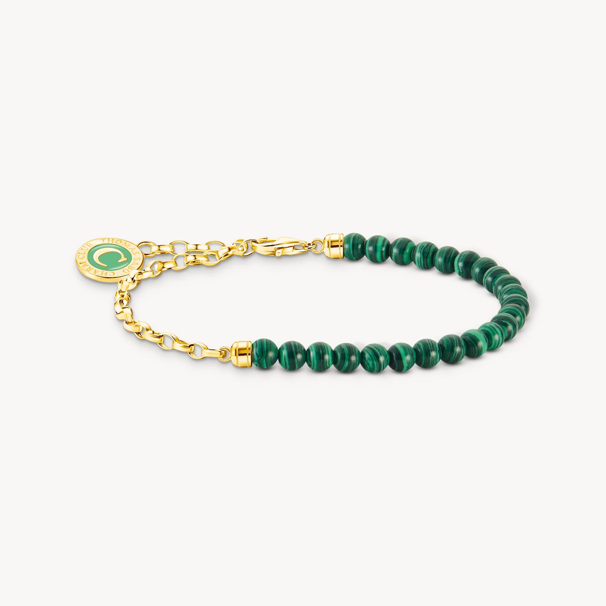 Charm-carrier: En kombination av ett länkarmband av högkvalitativt återvunnet 925 sterling silver med exklusiv plätering i 18K gult guld och ett armband med gröna pärlor av imiterad malakit skapar en spännande look. Änden på charm-armbandet pryds av en rund THOMAS SABO Charm Club Coin, handmålad med grön kallemalj.