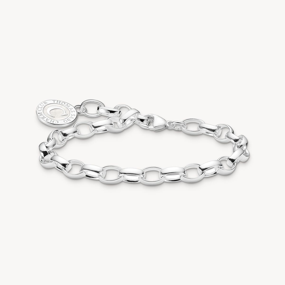 Charm-armbandet är exklusivt tillverkat av polerat återvunnet 925 sterling silver och pryds av ett runt THOMAS SABO Charm Club mynt. Detta är målat med vit, skimrande kallemalj.