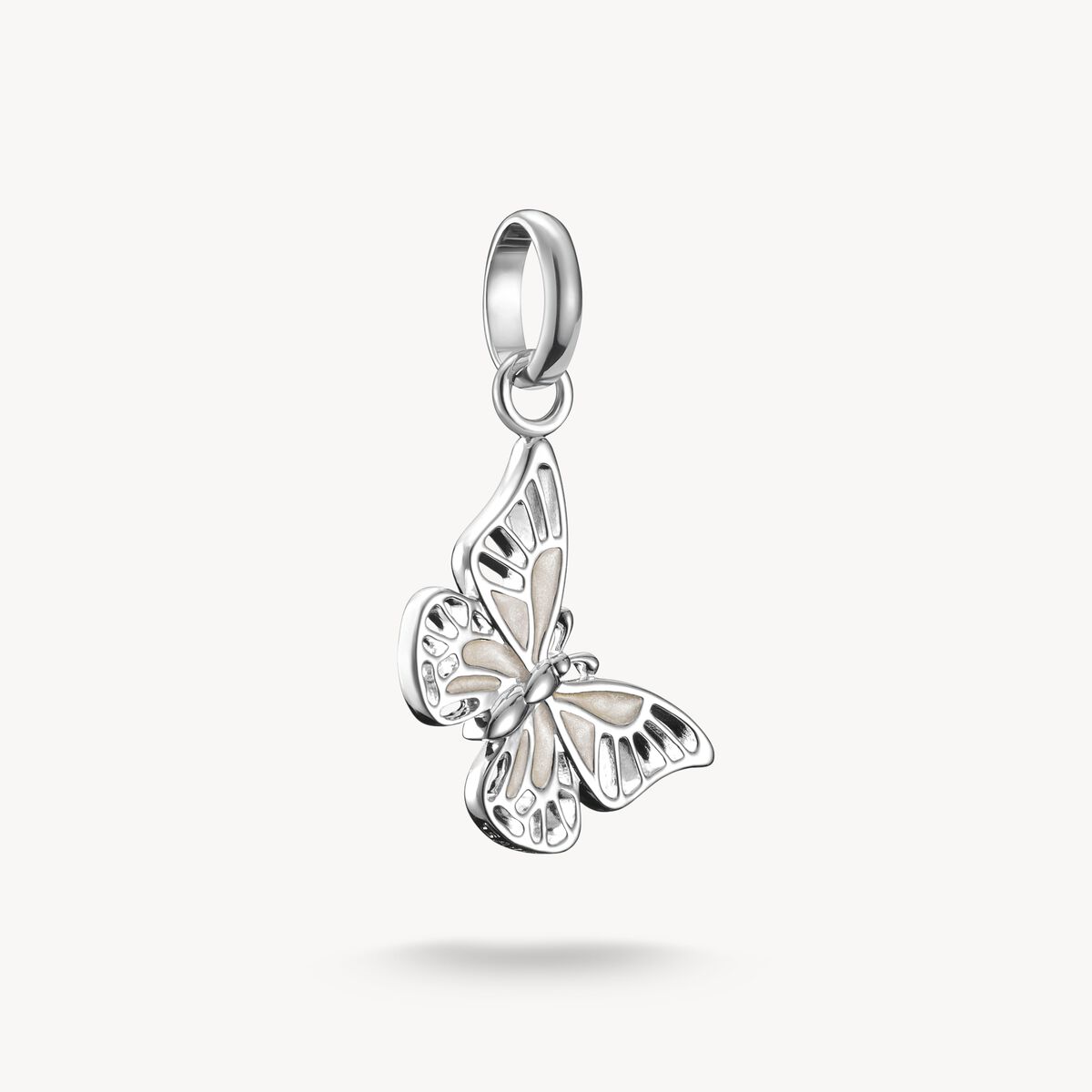 Den här fjärilsberlocken tillverkad av återvunnet silver med elegant 18k guldplätering är en inbjudan att drömma. Den är känslig och detaljerad. Fina utskärningar och handapplicerad emalj i skimrande vitt accentuerar fjärilens vingar. Du kan använda det här guldfärgade charm-hängsmycket för att skapa individuella smyckekombinationer på armband och halsband som passar din smak. Den filigrana öglan gör detta möjligt