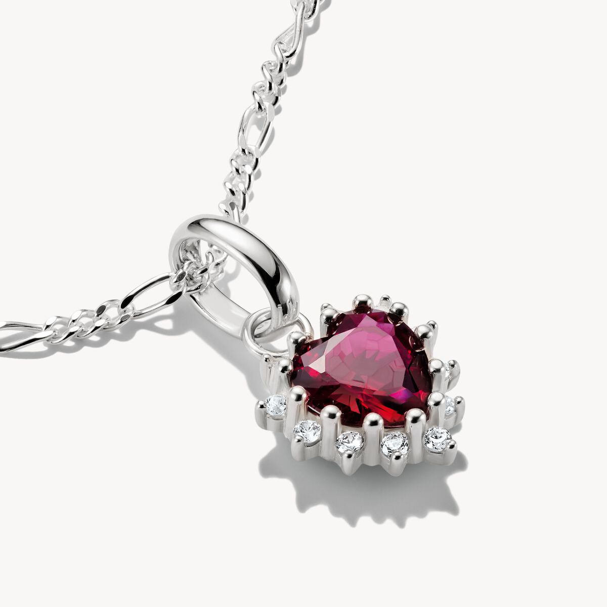 Visa dina känslor med denna romantiska berlock tillverkad av återvunnet silver. En djupt röd hjärtslipad lab-grown rubin gnistrar i mitten, inramad av små vita zirkoniastenar. Med sin filigranöglan kan charm armbandet bäras på halsband och armband och kombineras med andra hängen. Perfekt som present till din favoritperson eller som ett meningsfullt smycke som kan berätta din historia.