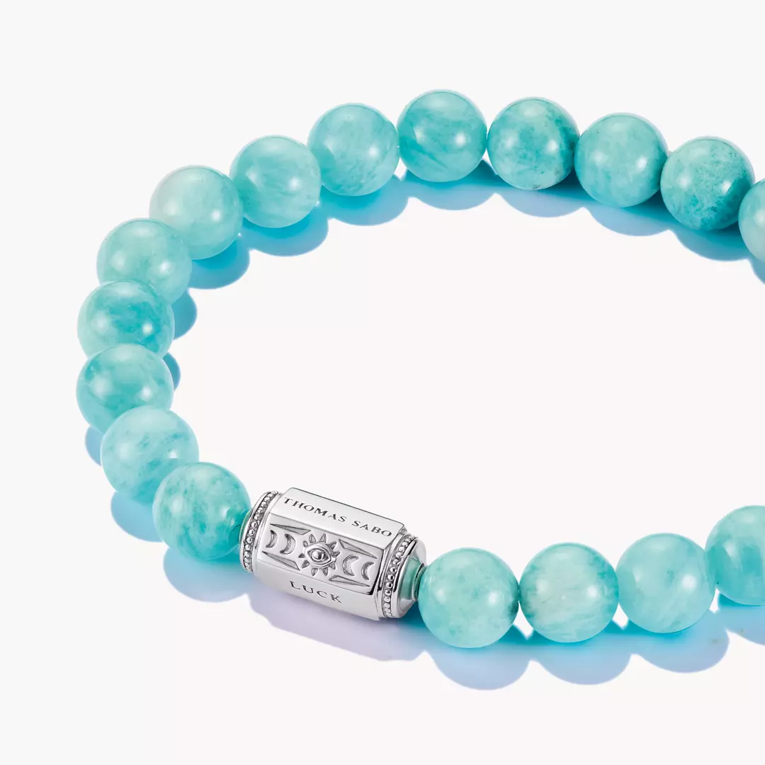 Mjuk i färgen, kraftfull i betydelsen: detta armband av amazonitpärlor skänker balans och positiv energi. I centrum glimmar en silverpärla med lycksymboler och gravyrerna THOMAS SABO och LUCK. Ett element som påminner om gamla, roterande skyddssymboler – rörligt och meningsfullt på samma gång. En modern talisman för stilfull närvaro.