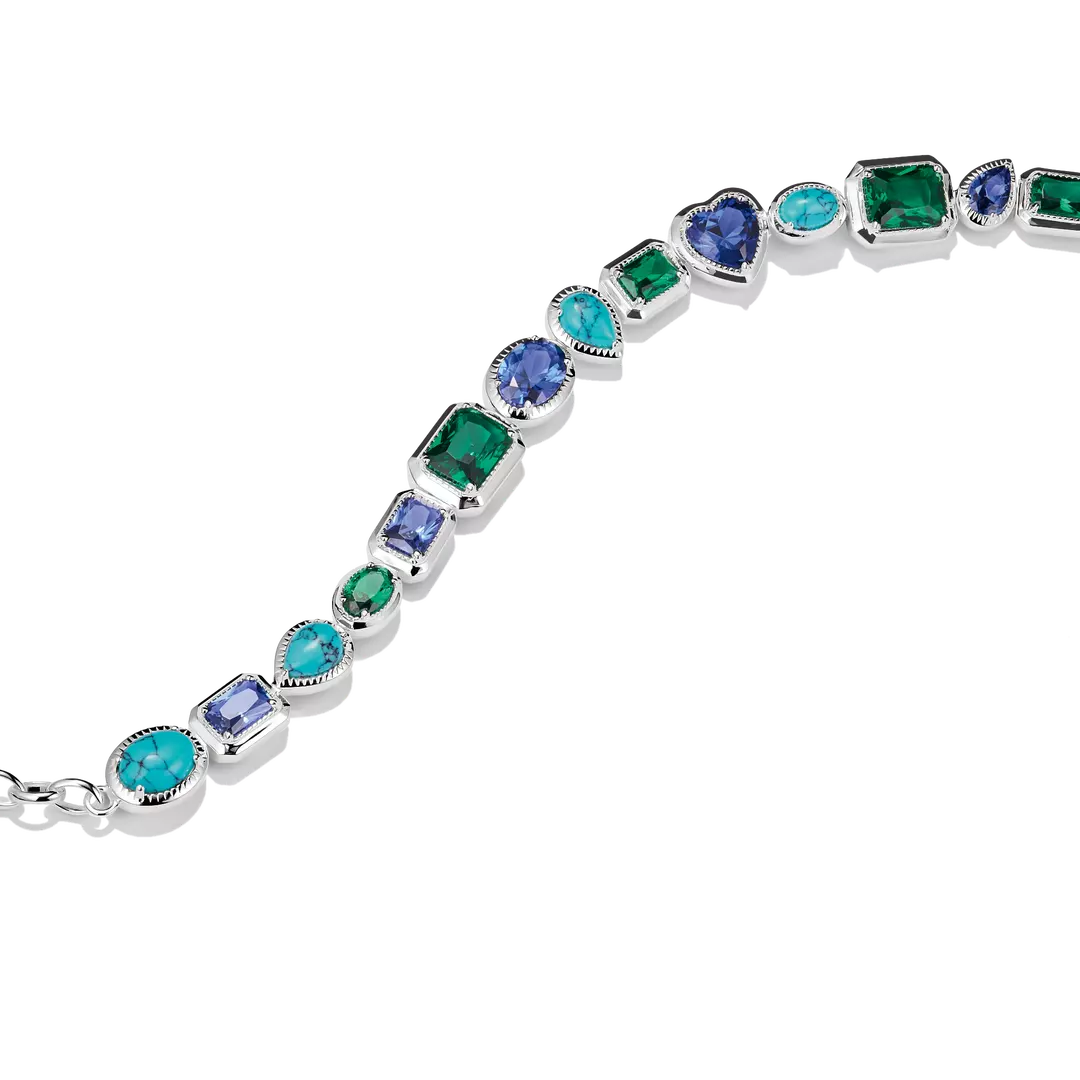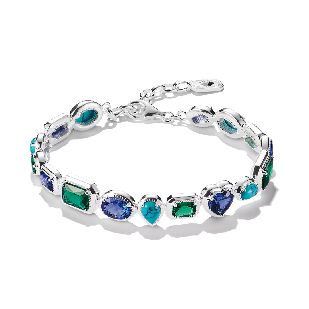 Detta Elyndra-armband i 925 sterlingsilver leker med blå och gröna nyanser i hjärt-, rund- och baguetteslipning som flyter in i varandra till en harmonisk komposition. De omsorgsfullt infattade stenarna ramas in av fina gravyrer och små, upphöjda prickar som vittnar om hög hantverksnivå och symbolisk betydelse.