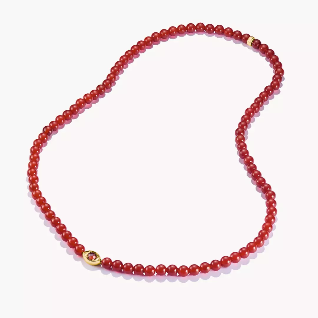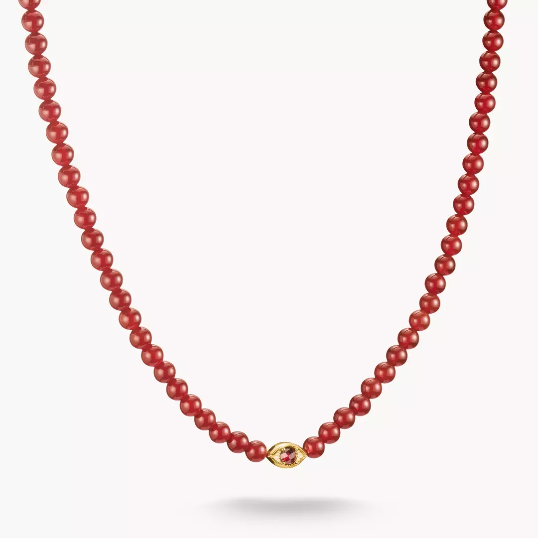 Värme, uttryck och inre styrka i kombination: runda polerade beads av djupröd agat ligger tätt intill varandra, medan ett guldpläterat öga med ljusa granatröda zirkoner vakar över mitten – en talismanisk accent för skydd och självförtroende. Halsbandet ingår i Elyndra-kollektionen och är ett karismatiskt statement som visar attityd och utstrålar positiv energi.