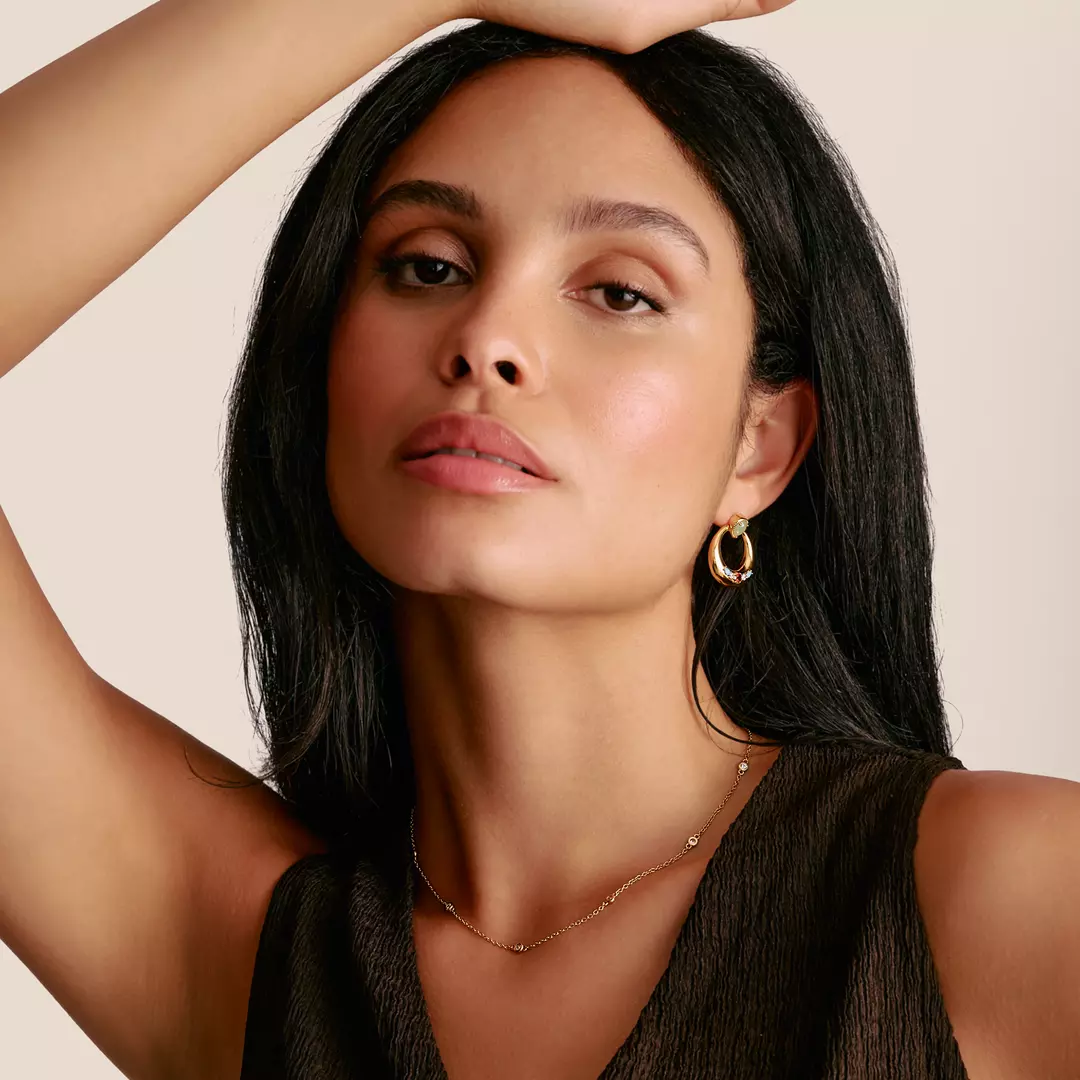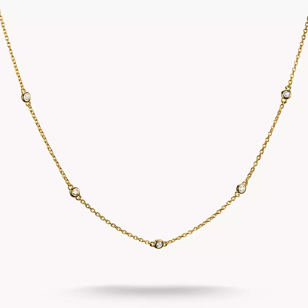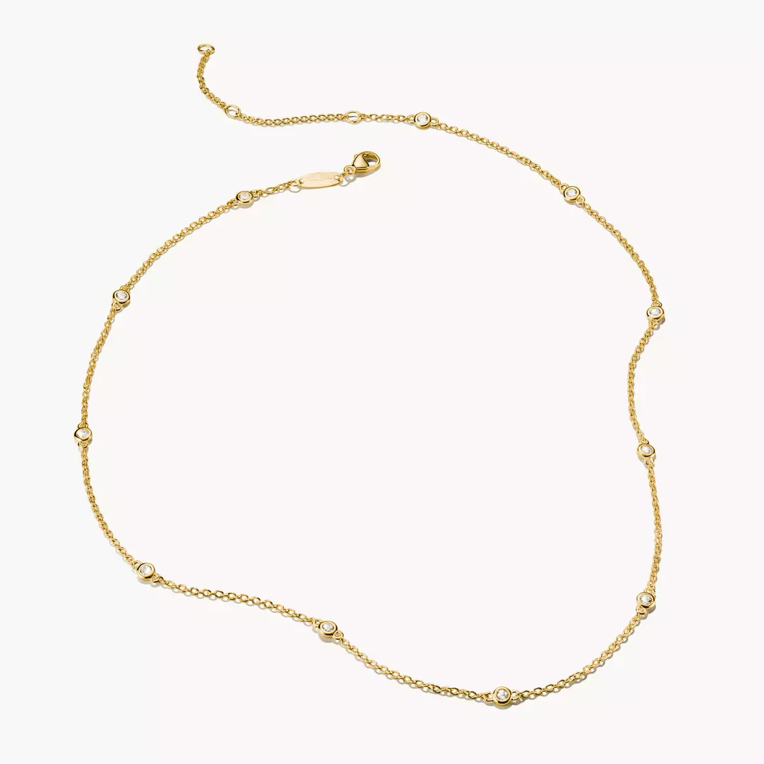 Varsamt skimmer för varje dag: den smala kedjan med 18k-förgyllning sprider mjuka ljuspunkter längs hela längden tack vare noggrant infattade zirkonior. Dess tidlöst lätta design följer dig från business-outfiten till kvällslooken och kan enkelt kombineras med andra halsband.