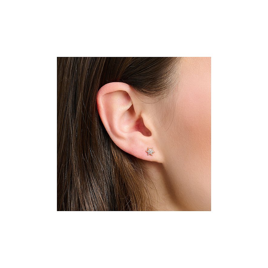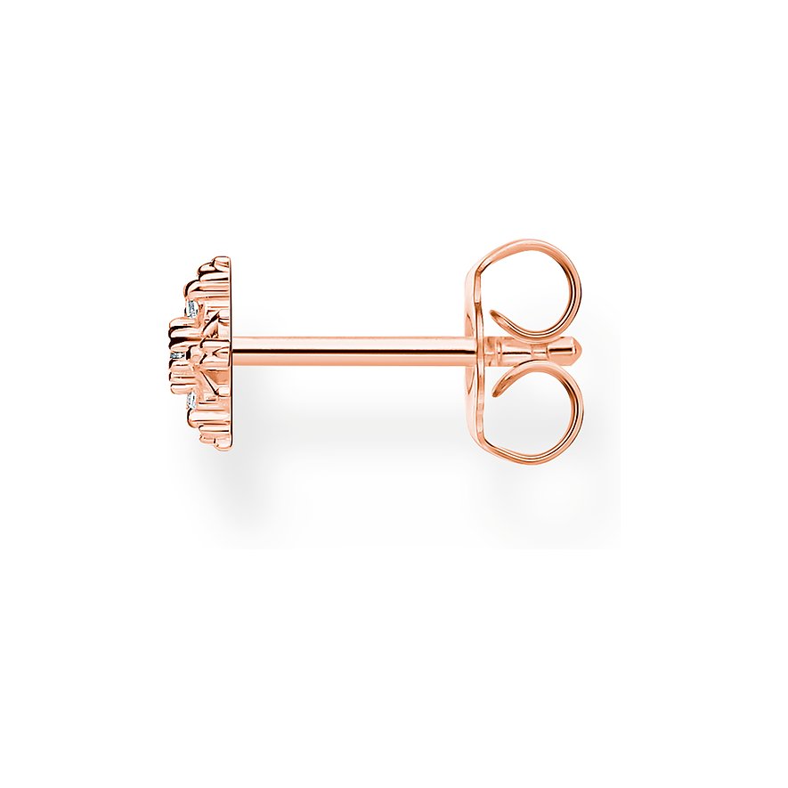 Örhänget är fint utformat som en snöflinga av exklusivt 925 sterlingsilver och pryds av plätering i 18 karat roséguld. Designen är arbetad i flera nivåer och pryds av vita zirkoniastenar samt fina gravyrlinjer. Det roséförgyllda örhänget kan bäras för sig eller kombineras med andra stiftörhängen, creoler, ear cuffs och ear climbers. Perfekt för originella looker i missmatchad stil.