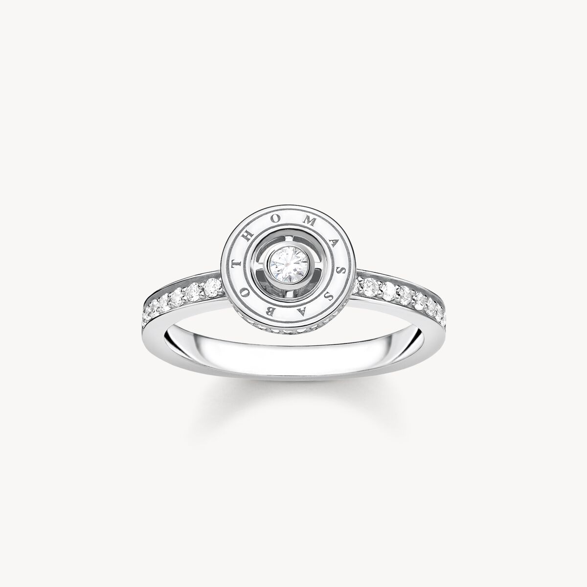 Blickfånget på den här ringen av återvunnet 925 sterling silver är den centrala ringformade designen, i vars mitt en fasetterad zirkoniasten reflekterar ljuset. Även ringskenan pryds av zirkoniastenar. Med THOMAS SABO-gravyr – ett smycke med tidlös karaktär.