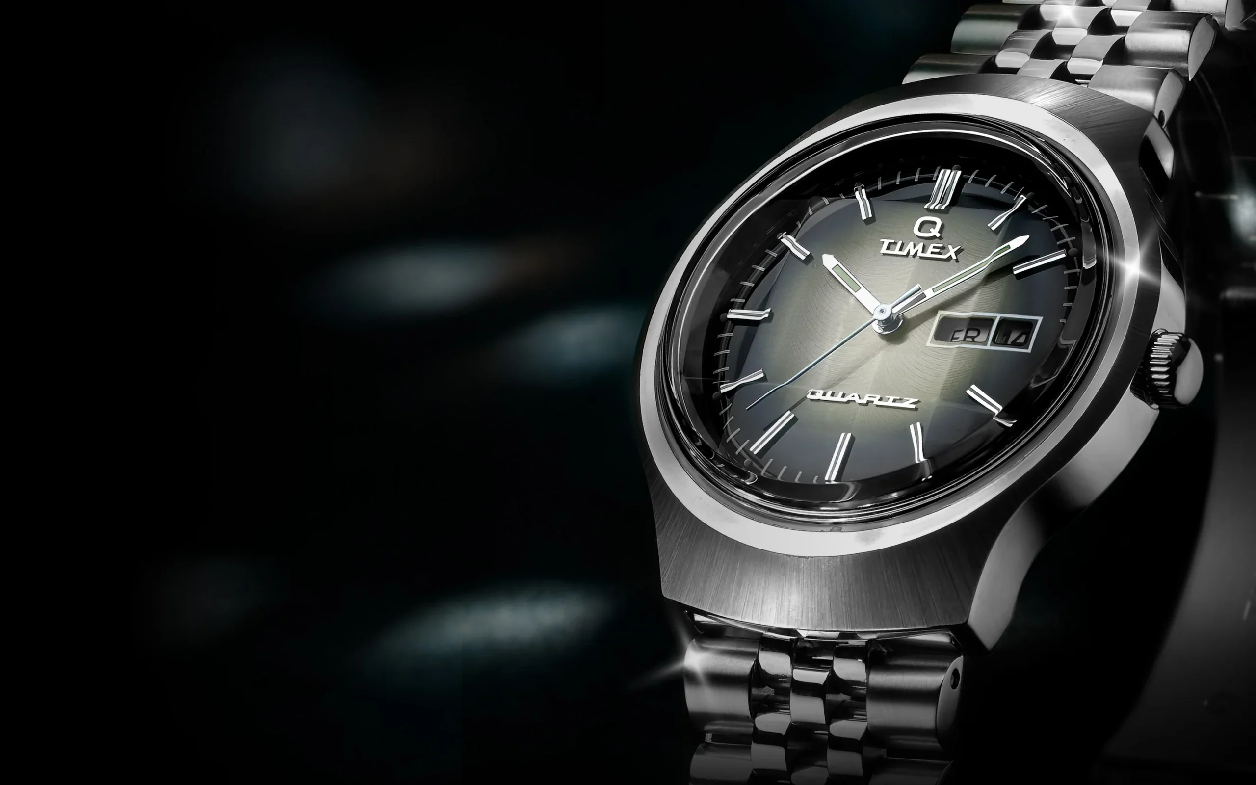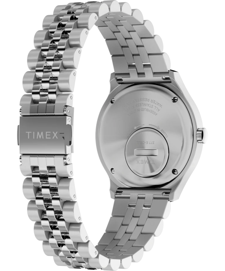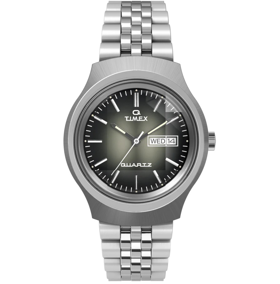 Vår Q Timex Reissue Dégradé är en fantastisk hyllning till en av våra mest ikoniska Q-modeller från slutet av 70-talet. Den förblir trogen den ursprungliga designen med en unik kupolformad akrylkristall med intrikata inre aspekter som fångar och bryter ljus för att producera en fängslande illusion av djup och textur. När ljuset träffar den glänsande dégradé-urtavlan avslöjas en vacker, komplex skärm med rökig färg. Dess lockelse sträcker sig längre med en elegant 38 mm väska i borstat rostfritt stål, matchande armband i rostfritt stål och ett dag- och datumfönster som den tredje timmen. I linje med sitt Q-arv har denna klocka precisionen hos ett kvartsurverk, vilket säkerställer oklanderlig noggrannhet för de som är på resande fot.
