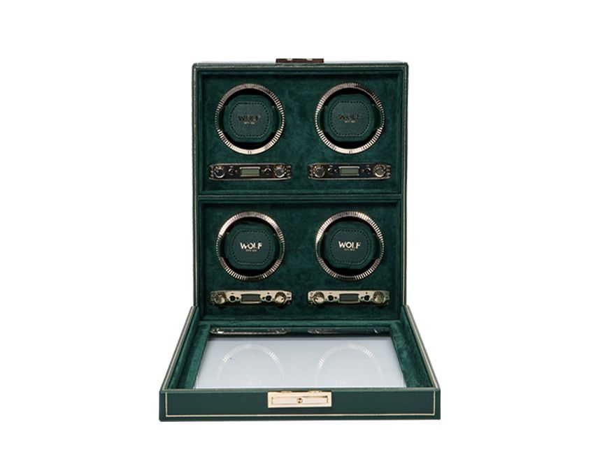 British Racing den gröna internationella motorsportfärgen på Storbritanniens bilar som tävlade i Irland i början av 1900 -talet med ett revolutionerande fyrkantigt panellock. Fina arbetsdetaljer inkluderar handpressade guldfolielinjer på veganvänligt stenlagd läder. Guld linjer hela vägen med kudde stänga gångjärn och räfflad ram. BRG, en annan design först från WOLF. Ta dina klockor ett varv i den trefaldiga klockrullen med förvaring.